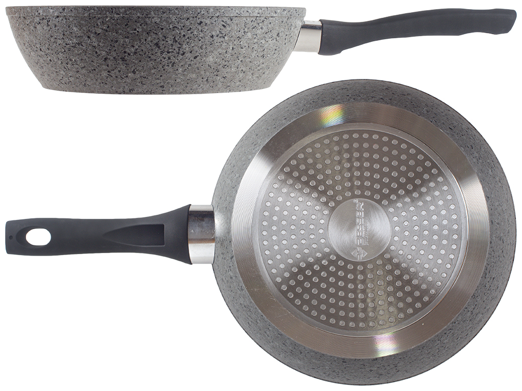 Сковорода лита Besser покриття "Granite". Діаметр: 26см. Розмір: без кришки 45,6х26,8х7,1см, розмір з кришкою 45,8х27х14см, висота ємності 7,1см. Розмір для транспортування 45,8х27х8,3см. Матеріал: пластик (ручка), алюміній (ємність) з покриттям "Granite", скло (кришка), метал (облямівка кришки). Індукційне дно. Підходить для використання на газових, керамічних і електричних плитах. Кріплення ручки кріпиться на заклепках, ручка до кріплення кріпиться гвинтом.