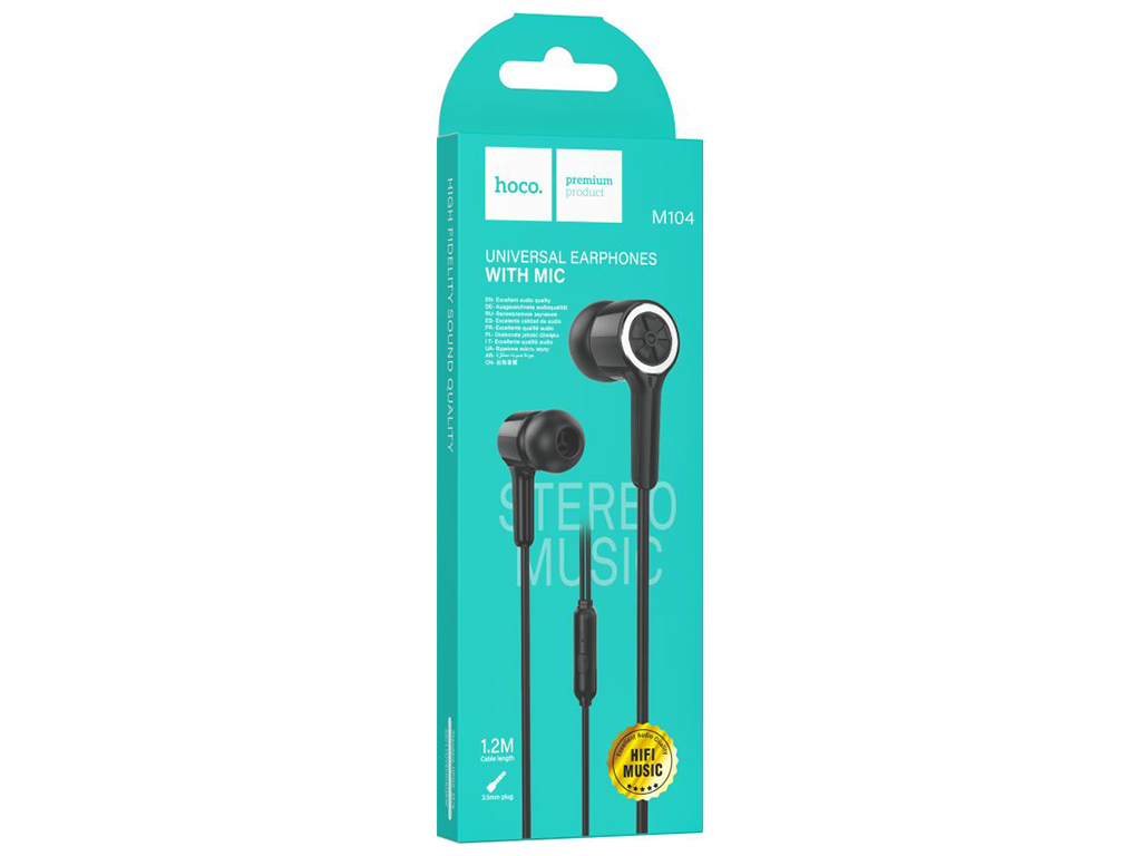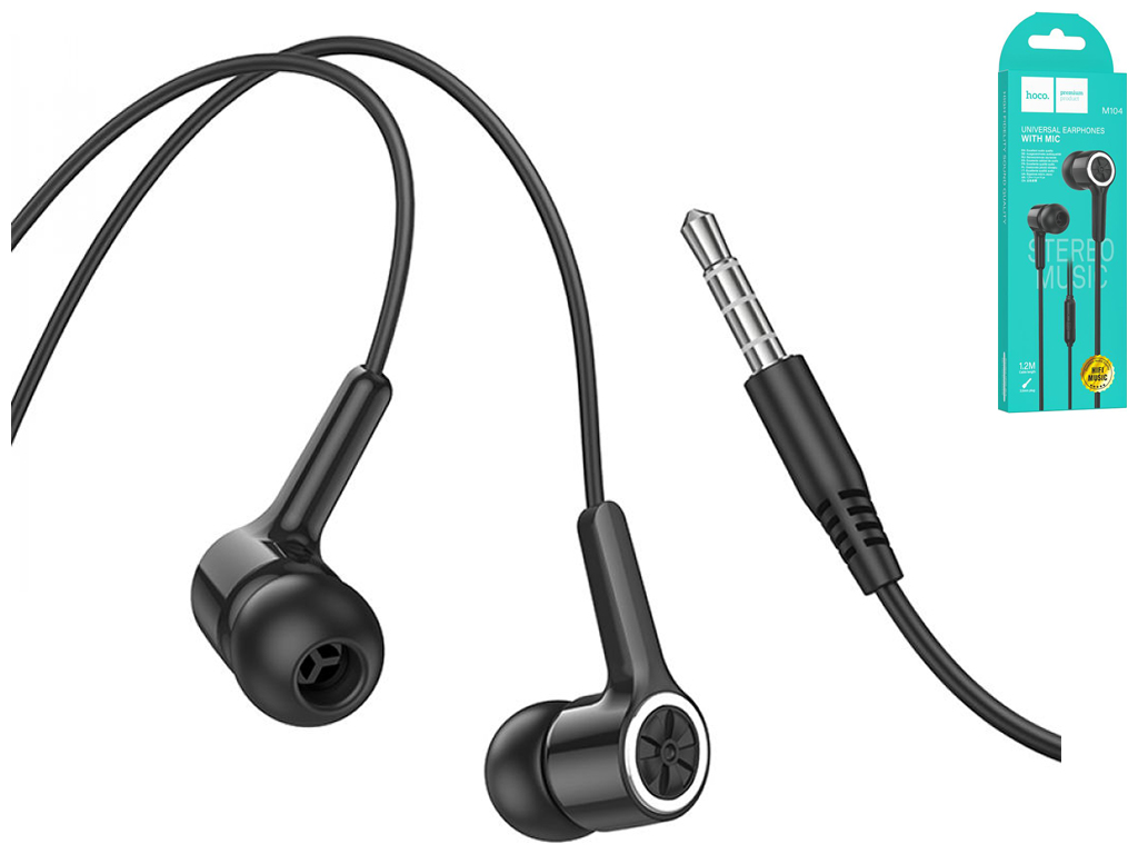 Hoco M104 - це універсальні вакуумні навушники, які сумісні з величезною кількістю аудіопристроїв та вирізняються якісним звучанням. Аксесуар реалізований у стильному, практичному дизайні, пропонується у двох класичних кольорах: у чорному та білому кольорах. Його невелика вага та продумана форма вушних елементів з ергономічними силіконовими амбушюрами забезпечать максимально комфортну повсякденну експлуатацію та щільну посадку у вушні канали, дозволяючи насолоджуватись улюбленою музикою, наприклад, у громадському транспорті або під час занять спортом. Корпусні деталі гарнітури надійно зібрані, виготовлені із міцного, приємного на дотик ABS пластику. Еластична, стійка до розривів та розтягувань зовнішня обплетення кабелю виконана з термопластичного еластомеру. За насичене відтворення низьких та високих частот відповідають вбудовані драйвери діаметром 10мм. Модель оснащена пультом з однією багатофункціональною кнопкою, відмінним мікрофоном та стандартним роз'ємом Mini-Jack 3,5мм. Довжина кабелю складає 1,2м.