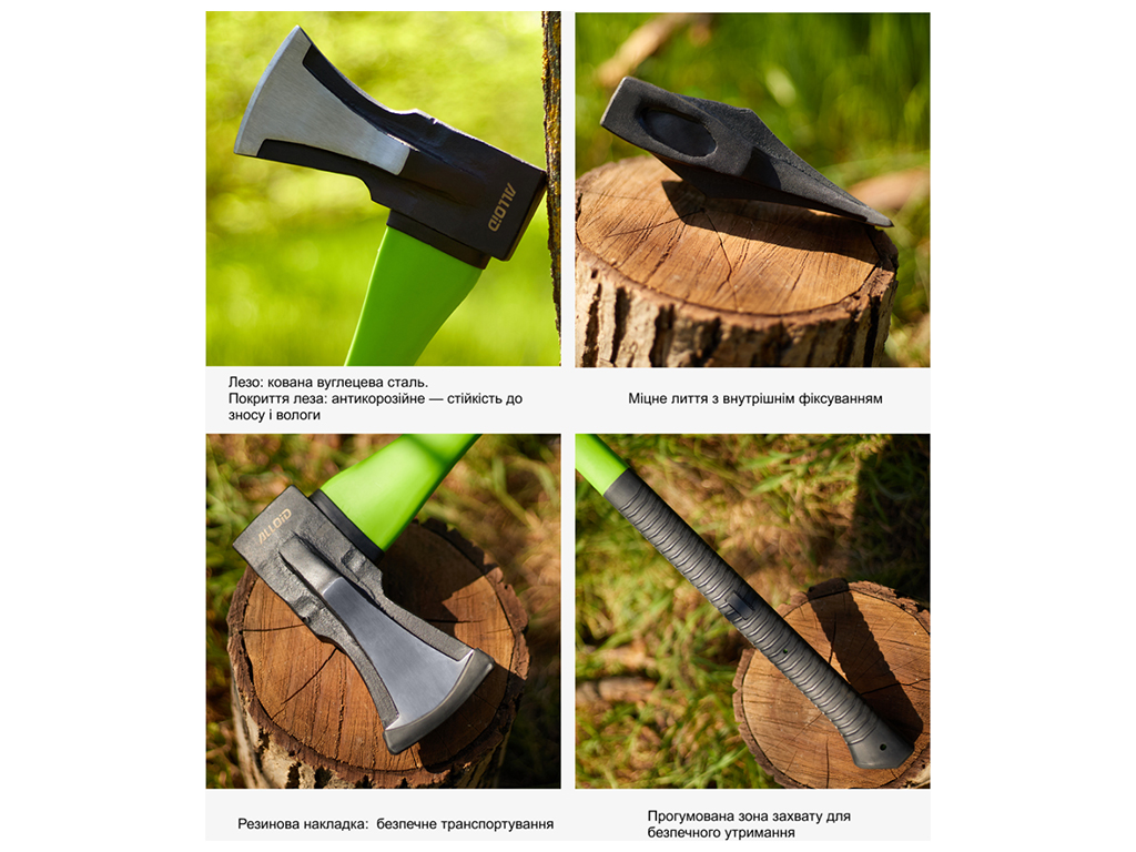 Призначена для ефективної колки дров, обробки деревини та виконання будівельних робіт. Загартоване лезо зі сталі витримує інтенсивні ударні навантаження, не деформується та надовго зберігає заточку. Прогумована фібергласова ручка не вбирає вологу, стійка до пошкоджень та забезпечує безпечний хват навіть у складних умовах. Лезо: загартована інструментальна сталь, стійка до зносу. Покриття: антикорозійне, матове чорне. Руків’я: фіберглас, з прогумованою зоною захвату.