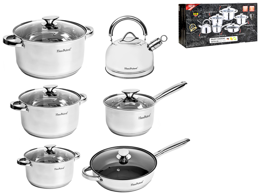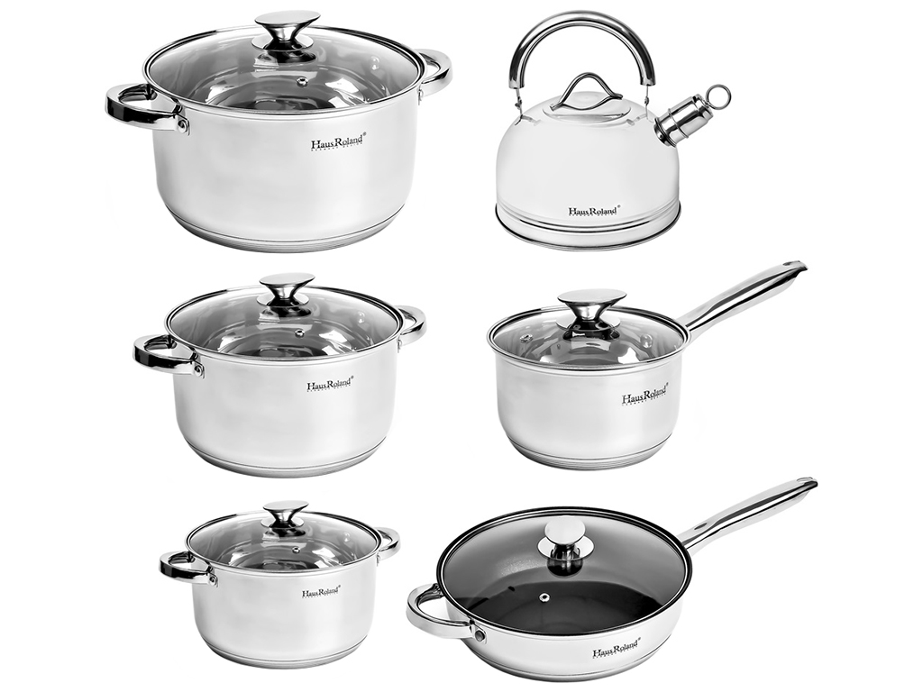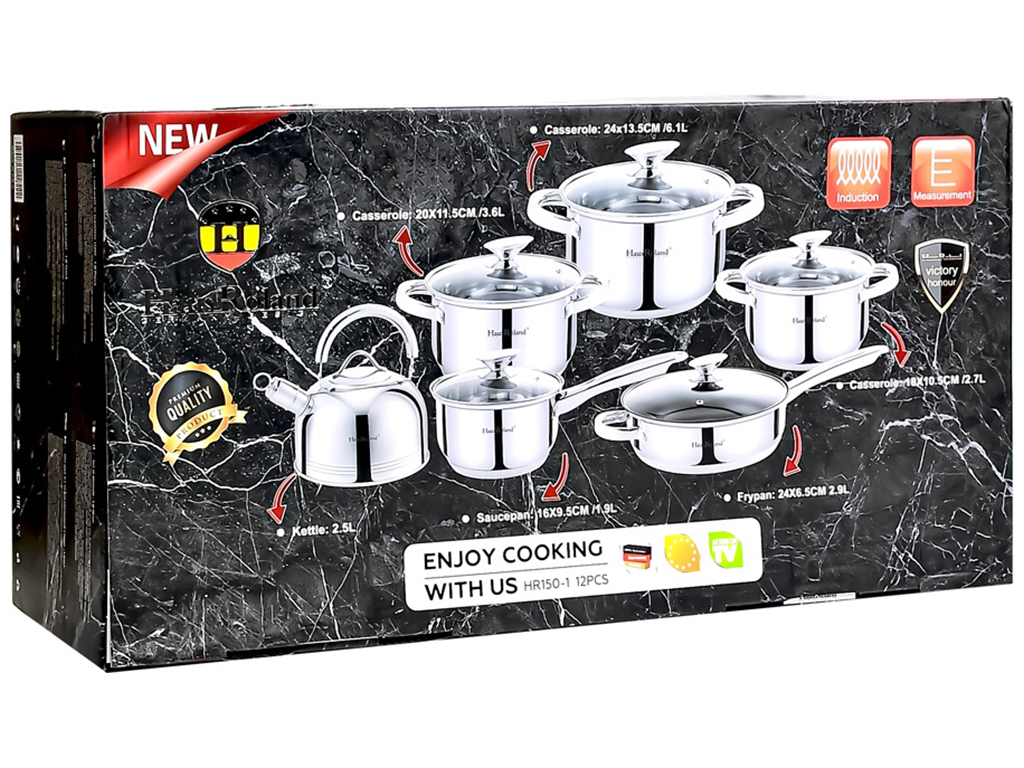 Набір посуду HausRoland, 5сл. з індукційним дном. Кількість предметів у наборі: 12шт. У набір входить: каструля (3шт), ківш (1шт), чайник (1шт), сотейник (1шт), кришки (5шт). Матеріали: нержавіюча сталь, скло. Упаковка: кольорова коробка. Кастрюлі об'ємом: 6,1л, 3,6л, 2,7л, 1,9л, сотейник 2,9л, чайник на 2,5л.