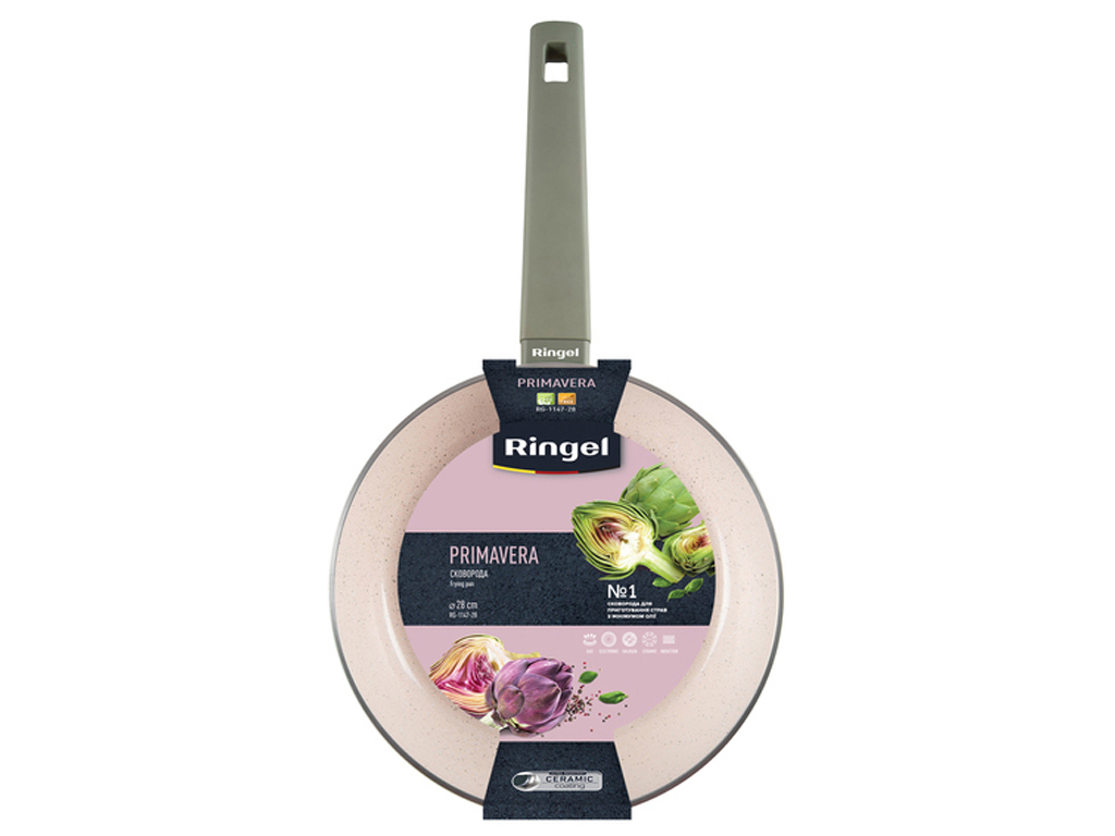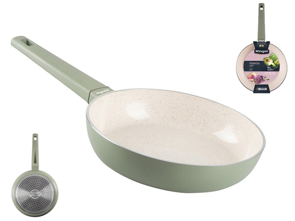 Сковорода Primavera від Ringel поєднує в собі високу якість та екологічність. Цю сковорідку виготовлено з високоякісного алюмінію завтовшки 4мм, що забезпечує рівномірний розподіл тепла та швидку передачу його вашим стравам. Сковорода оснащена стійким антипригарним керамічним мармуровим покриттям Rhitz, яке полегшує процес приготування і гарантує чудовісмакові якості страв. Додаткове зовнішнє антипригарне покриття збільшує термін служби сковороди, зберігаючи її привабливий зовнішній вигляд і полегшуючи догляд за нею. Зручність використання забезпечується ручкою з термостійкого бакеліту з покриттям Soft Touch, яка не нагрівається в процесі приготування, забезпечуючи комфорт і безпеку під час експлуатації. Індукційний антидеформаційний диск робить цю пательню універсальною, даючи змогу використовувати її на всіх типах плит, включно з індукційними. Діаметр сковороди становить 28см, що робить її ідеальним вибором для приготування різних страв. Без кришки.