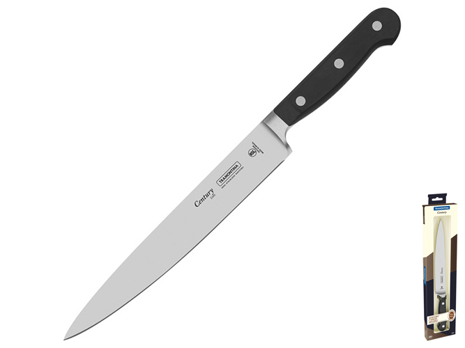 Ніж Tramontina Century 20,3см. Матеріал леза: нержавіюча сталь. Матеріал ручки: полікарбонат. Ріжуча край ножа: гладка. Колір: чорний. Призначення ножа: кухарський. Руків'я витримує температуру 200?С. Можна мити в посудомийній машині. Розмір: 33,3х1,5х3,2см. Довжина леза: 20,7см.