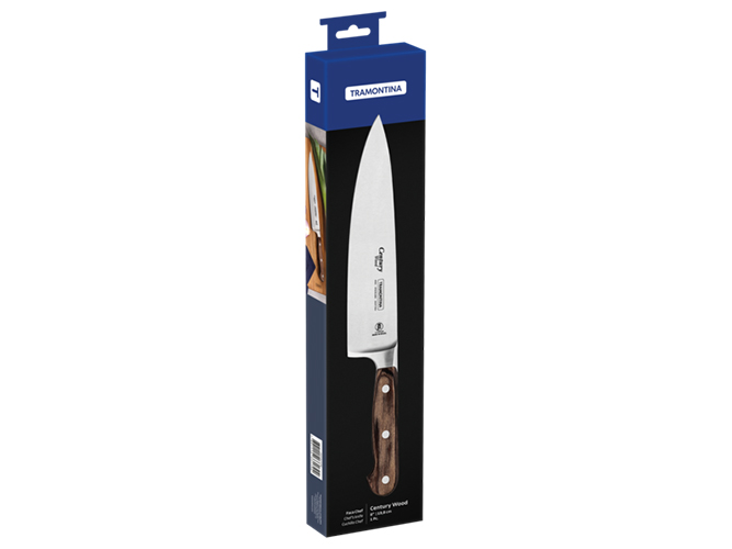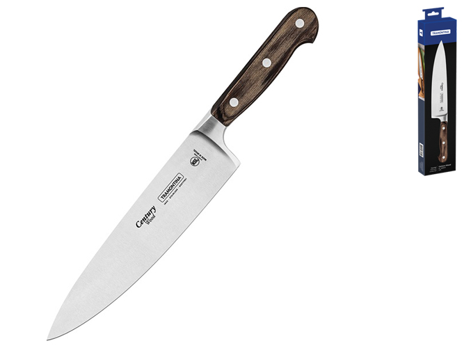 Ніж Tramontina Century Wood Шеф. Матеріал леза: нержавіюча сталь. Матеріал руків'я: оброблене дерево. Ріжуча крайка ножа: гладка. Колір: дерево. Можна мити в посудомийній машині. Довжина леза: 20,3см.