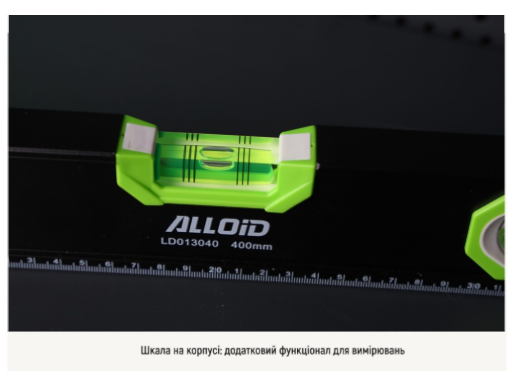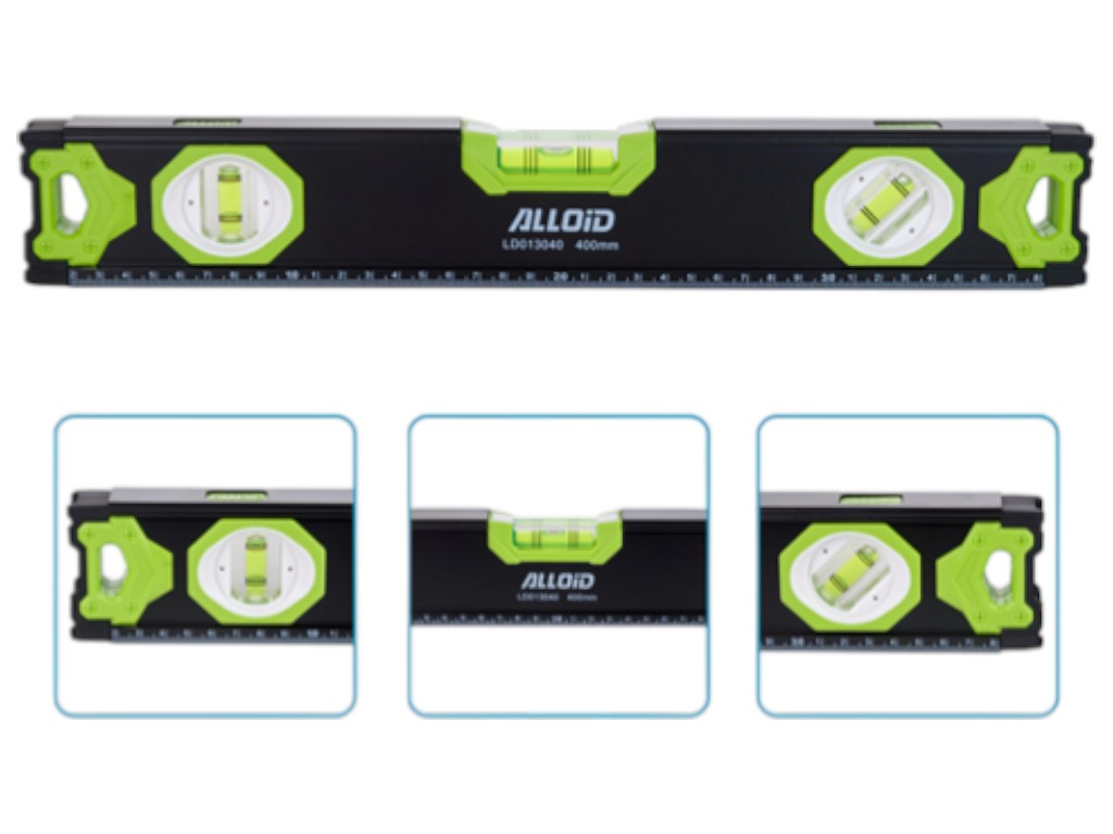 Алюмінієвий анодований корпус забезпечує точність при виконанні вимірювань у горизонтальній, вертикальній та похилій площині. Три вимірювальні капсули з кутами 0 °, 45 ° і 90 ° дозволяють виконувати розмітку в різних положеннях. Вбудовані магніти на підставі фіксують рівень на металевих поверхнях, а прямокутна форма з вирізами полегшує утримання в руці. На корпус нанесена міліметрова шкала, що зручно при виконанні супутніх вимірювань. Підходить для будівельних, монтажних та слюсарних робіт.