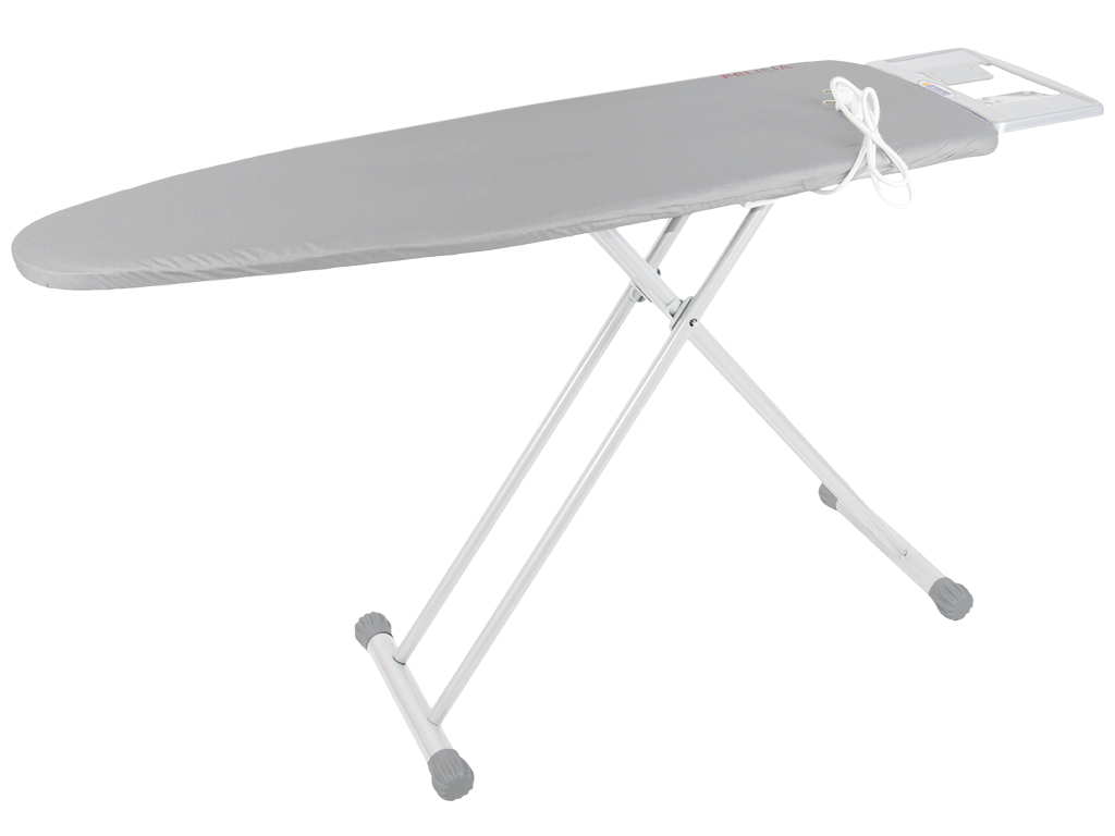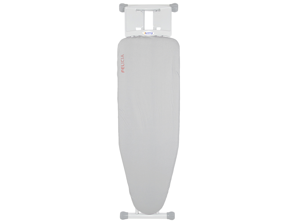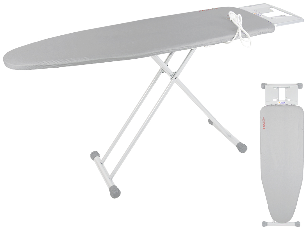 Прасувальна дошка Felicia з металевою стільницею і знімним подовжувачем з однією розеткою, укомплектована підставкою для праски. Робоча частина прасувальної дошки Felicia виготовлена ??зі сталі. На основі ніжок надягнуті ковпачки, що оберігають прасувальну дошку від ковзання. На дошці є покриття 100% бавовна, яке легко знімається і переться. У міру використання його завжди можна замінити новим. Розмір стільниці: 125х42см (довжина з підставкою для праски 147см). Регулювання висоти від 40 до 87см (8 позицій). Підставка під праску стаціонарна 30х13см. Транспортувальний розмір: 42,8х7,5х155,5см. Упаковка: поліетилен.