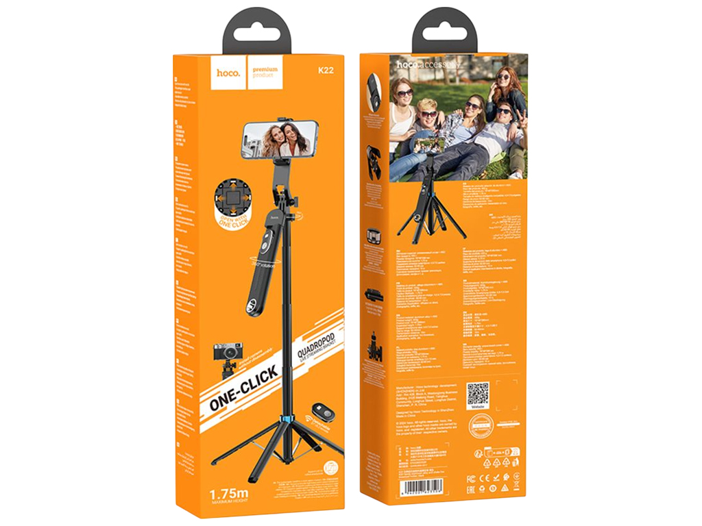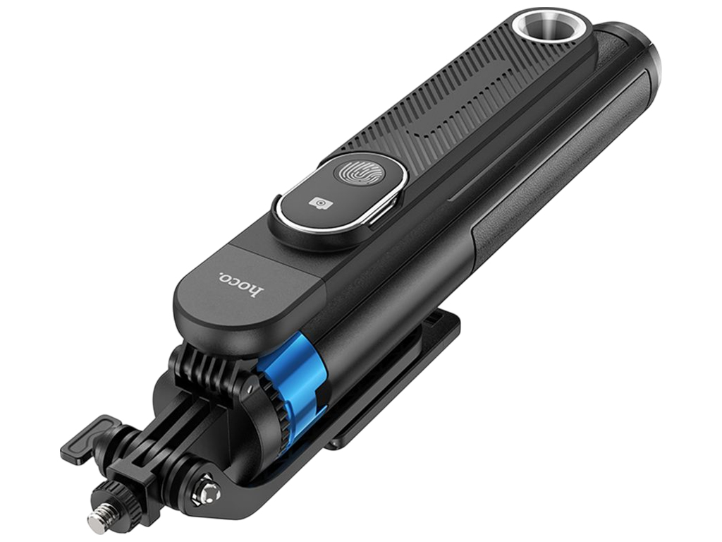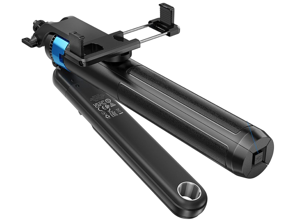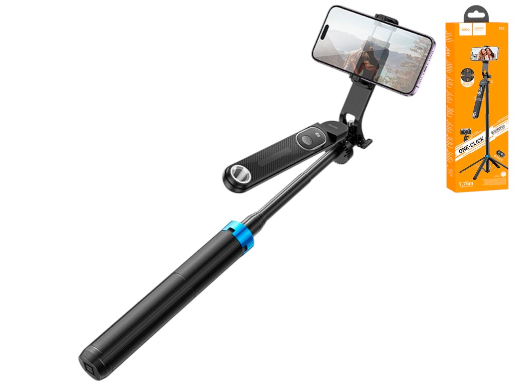 Складаний штатив Hoco K22 оснащений висувною телескопічною штангою, шарнірним тримачем та знімним пультом управління. Підтримує бездротове підключення через Bluetooth 5.2, підходить для смартфонів шириною від 62 до 90мм. Корпус виконаний з ABS-пластику та алюмінієвого сплаву. Конструкція трансформується з монопода у стійкий штатив. Управління фото та відеозйомкою здійснюється за допомогою вбудованого пульта з акумулятором 55mAh. Сумісний з камерами та аксесуарами завдяки стандартному різьбовому кріпленню. Працює до 2 годин без заряджання.