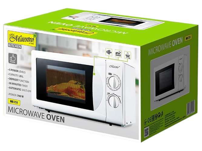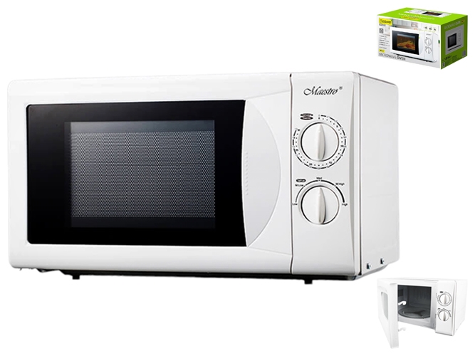 Мікрохвильова піч Maestro має сучасний ергономічний дизайн. Є 5 рівнів потужності. Функція розморожування. Таймер на 30 хвилин. Автоматичне вимкнення. Об'єм: 20л. Потужність: 220-240В, ~50Гц, 700Вт.