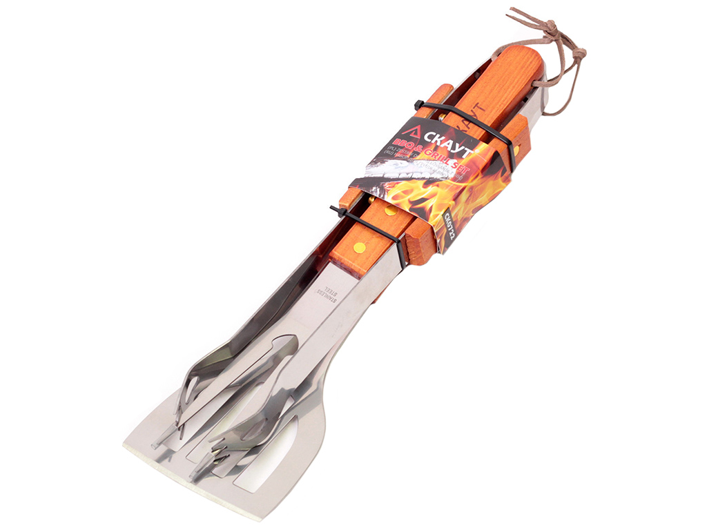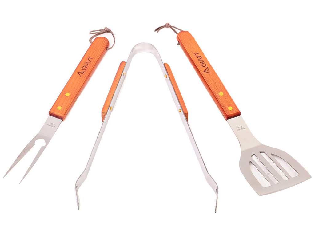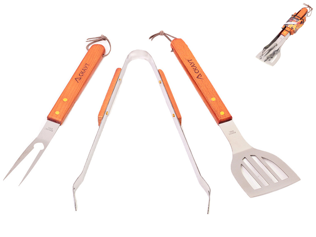 Набір для гриля Скаут надійний помічник для приготування їжі на відкритому повітрі, дерев'яні ручки безпечні під час використання, міцні та зручні інструменти з неіржавкої сталі роблять процес приготування барбекю легким і приємним. Кількість предметів у наборі: 3шт. Комплектація: лопатка 35см, вилка 33см, щипці 33см.