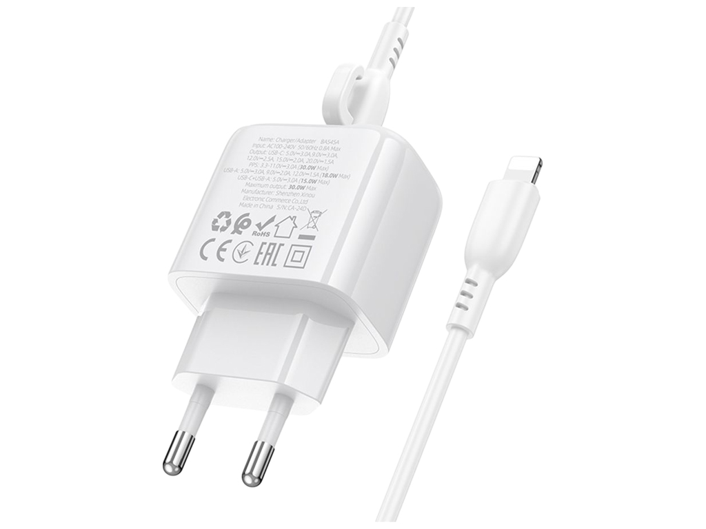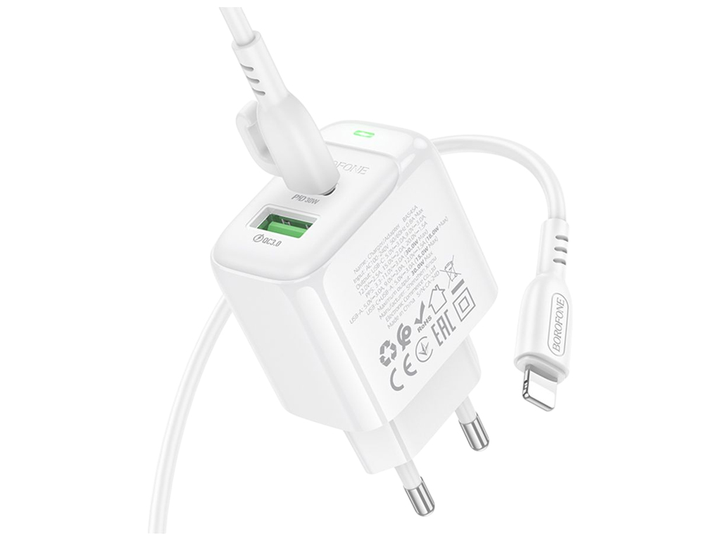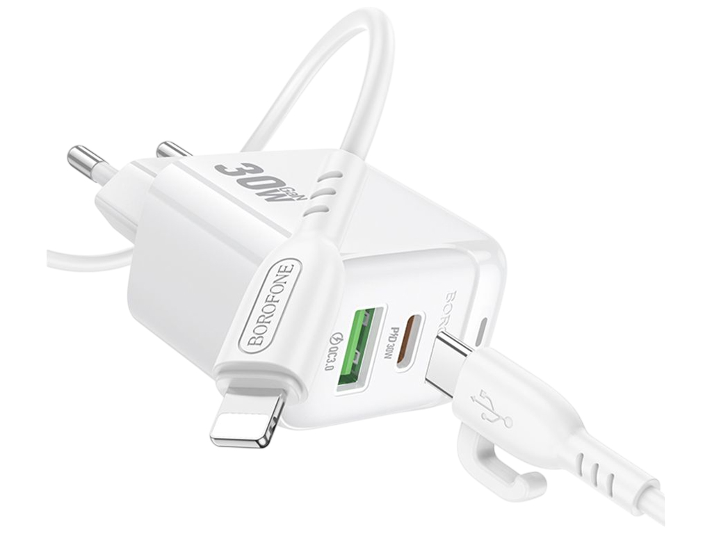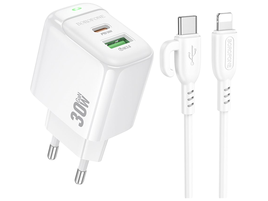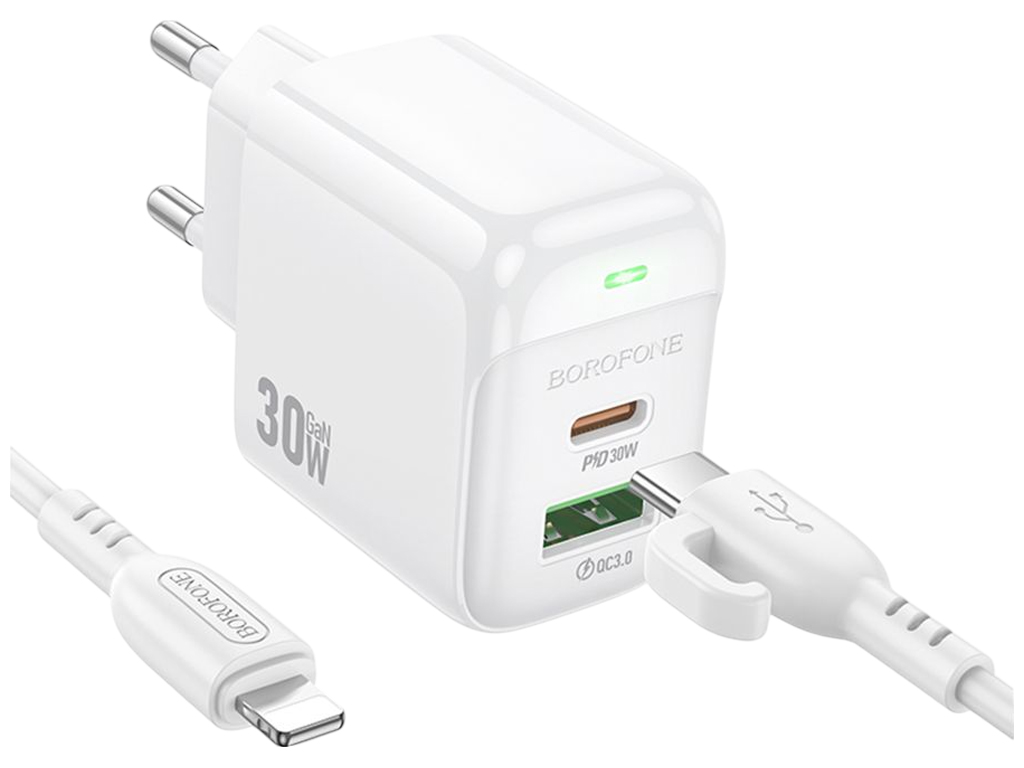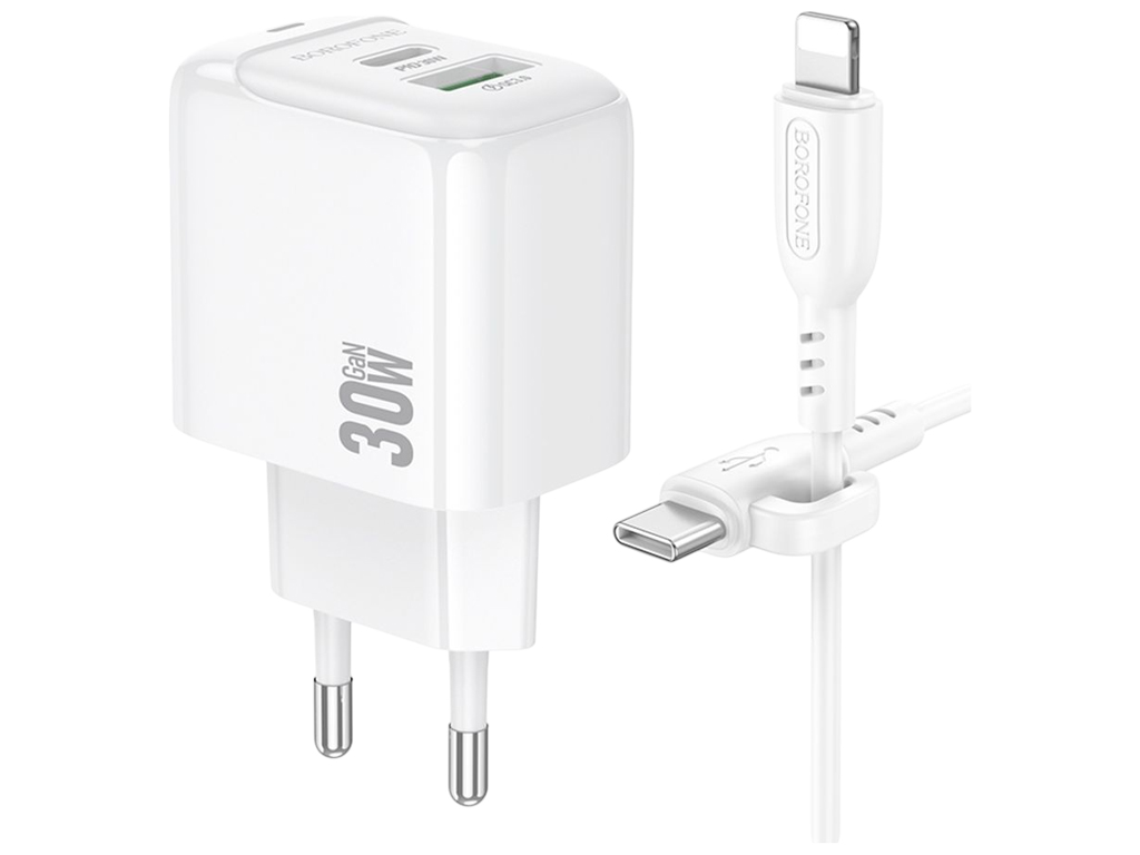 Зарядний пристрій Borofone BAS45A, 1USB-C/1USB, PD/QC 30W, Type-C to Lightning, білий