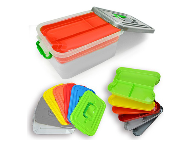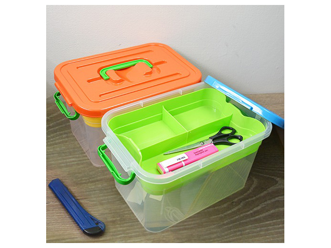 Ящик універсальний Прозорий зі знімною полицею. Об'єм: 6,3л. Розмір: 19х27,5х16см. Матеріал: пластмаса. Забарвлення кришок асорті. Без індивідуального впакування.