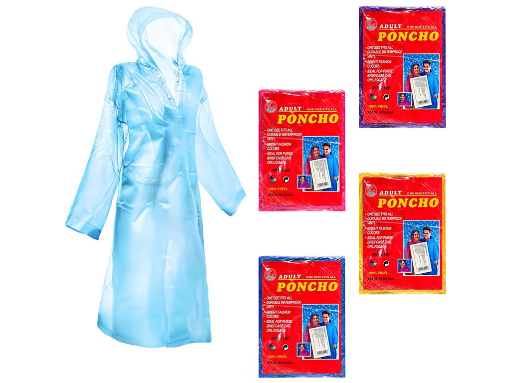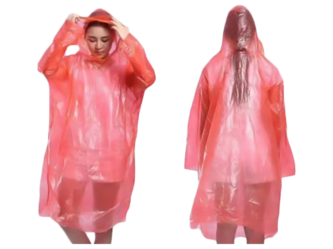 Одним з вкрай важливих предметів гардеробу є дощовик, який врятує не лише під час дрібного дощу, що мрячить, а й під час сильної зливи. Перебуваючи в горах, у різних походах або навіть просто йдучи вулицею, погода може нас здивувати. Якщо у випадку дрібного дощу, що мрячить, цілком достатньо парасольки або каптуру від толстовки, то злива може бути дуже сильною. Тому варто озброїтися дощовиком, він легкий, не займає багато місця і обов'язково виручить навіть у найсильнішу зливу. Кольори: синій, жовтий, рожевий, фіолетовий.