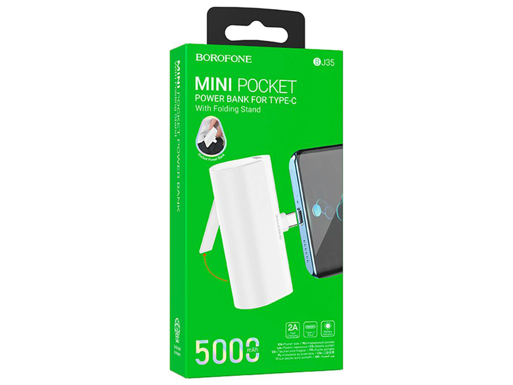 Power Bank Borofone BJ35 Pocket Type-C - це легкий, надзвичайно компактний зовнішній акумулятор, спеціально розроблений для максимально комфортної зарядки сучасних смартфонів. Він привертає увагу оригінальним дизайном, виділяється простотою у використанні та високою надійністю. Компактні розміри 81х25мм і невелика вага 95г. Надійний корпус із міцного ABS пластику та вогнестійкого полікарбонату. Механічна кнопка і LED індикатори для контролю рівня заряду. Вихідний роз'єм Type-C типу male - безпосереднє під'єднання до сумісних пристроїв для заряджання без додаткового кабелю. Вхідний роз'єм Type-C типу female для заряджання самого повербанка. Максимальна сила струму на вході та виході: 2A за напруги 5V. Захисний ковпачок вихідного роз'єму для безпечного транспортування. Складна підставка для зручного розташування смартфона під кутом у горизонтальному положенні. Багаторівнева система захисту від перезаряду, перерозряду, перевантаження за струмом, стрибків напруги та короткого замикання.