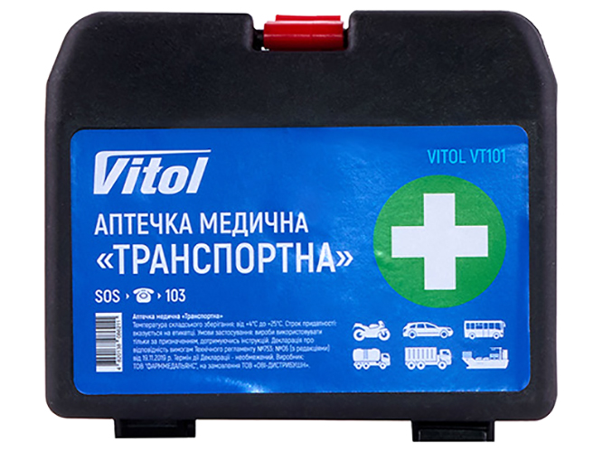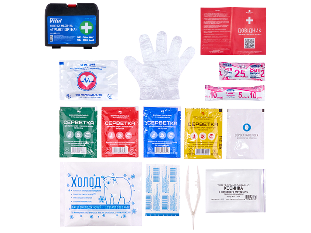 Аптечка транспортна – це спеціально укомплектований набір медичних виробів та лікарських засобів, призначений для використання у різних видах транспорту (наземному, повітряному, водному). Вона забезпечує можливість швидкого надання першої домедичної допомоги як самостійно, так і за участю інших осіб. До складу аптечки входять засоби для обробки та перев’язки ран, дезінфекції, а також допоміжні матеріали. Також міститься довідник з надання першої допомоги та рекомендації щодо застосування вкладених засобів.