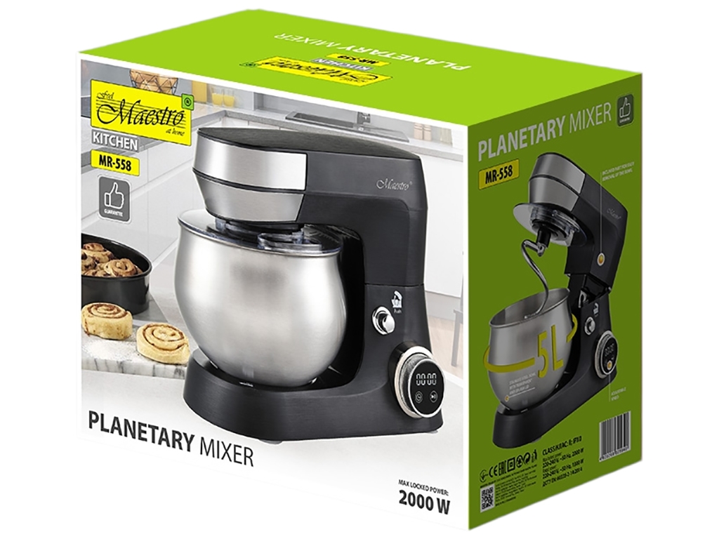 Міксер Maestro має планетарне обертання для ретельного перемішування. Чаша з нержавіючої сталі об’ємом 5л з прозорою кришкою, що захищає від бризок. Підйомна частина дозволяє легко знімати миску і міняти аксесуари. Кришка чаші з отвором для додавання інгредієнтів у будь-який час. Має LED дисплей, три насадки, 12 швидкостей і протиковзкі ніжки. Потужність: 220-240В, ~50Гц, 2000Вт.