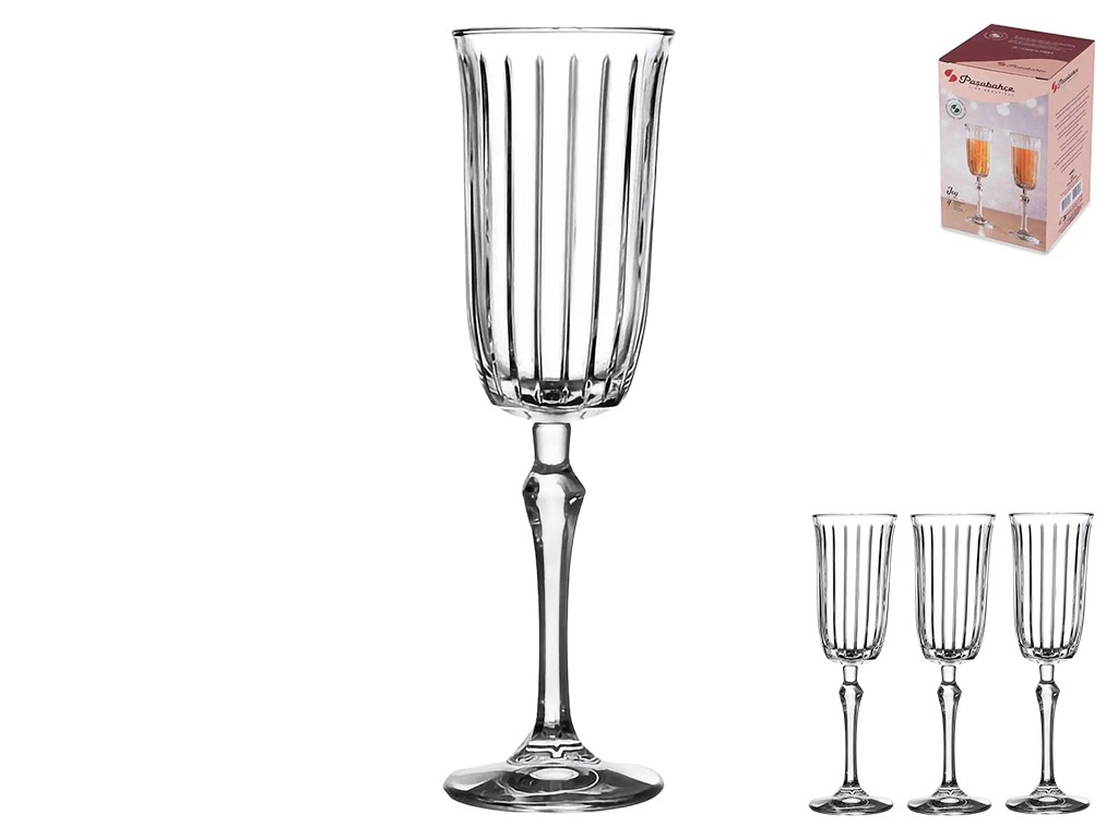Використовується для подачі шампанського, просекко та інших ігристих напоїв. Виготовлений з тонкого прозорого скла, стійкого до подряпин та пошкоджень. Келихи мають витягнуту форму, що сприяє збереженню аромату та ігристості напою. Підходять для домашнього використання та сервірування у ресторанах. Допускається миття в посудомийній машині.