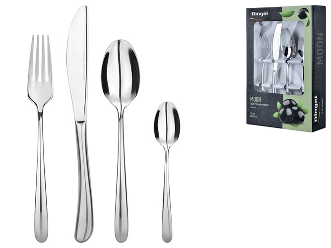 Набір столових приборів MOON за лічені секунди подарують вашому столу святковий, вишуканий і стильний вигляд. Матеріал: високоякісна нержавіюча сталь. Дзеркальне полірування приборів. Якісна обробка внутрішнього краю. Універсальний і стильний дизайн, що буде пасувати до будь-якого стилю сервірування.