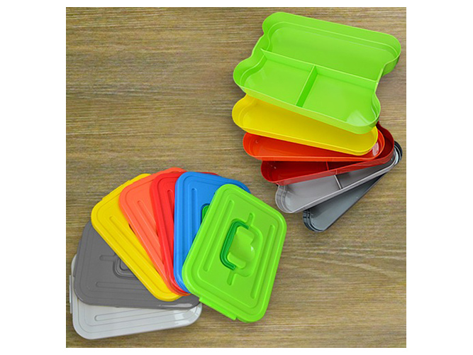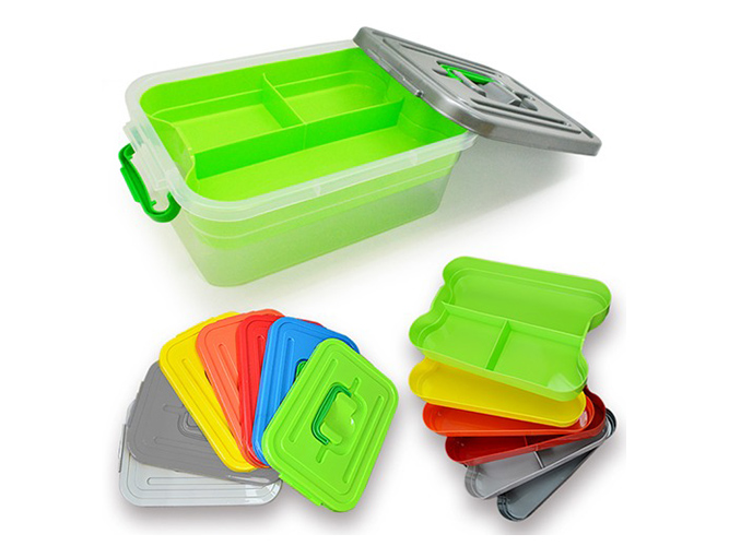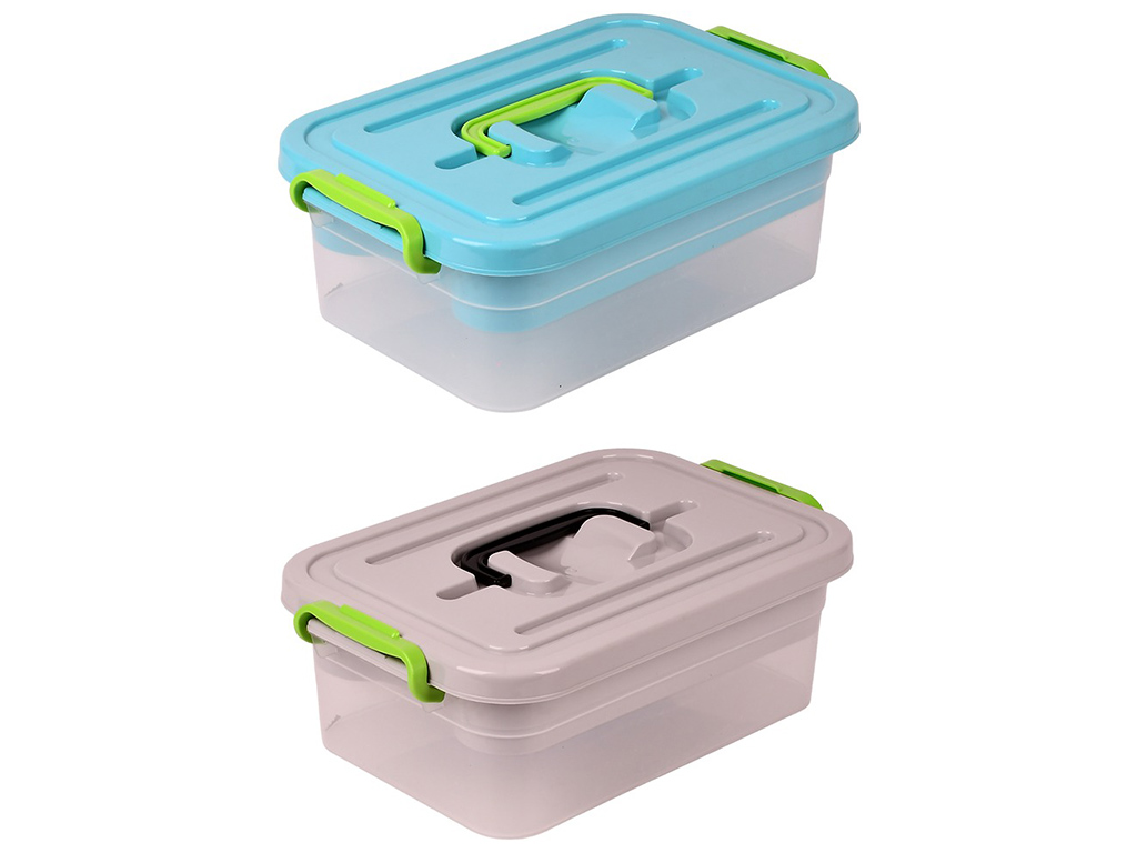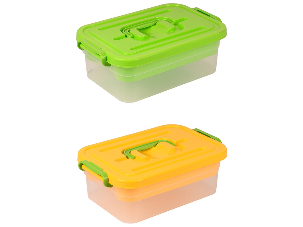 Ящик універсальний Прозорий зі знімною полицею. Об'єм: 3,8л. Розмір: 19,5х28х10,5см. Матеріал: пластмаса. Забарвлення кришок асорті. Без індивідуального впакування.