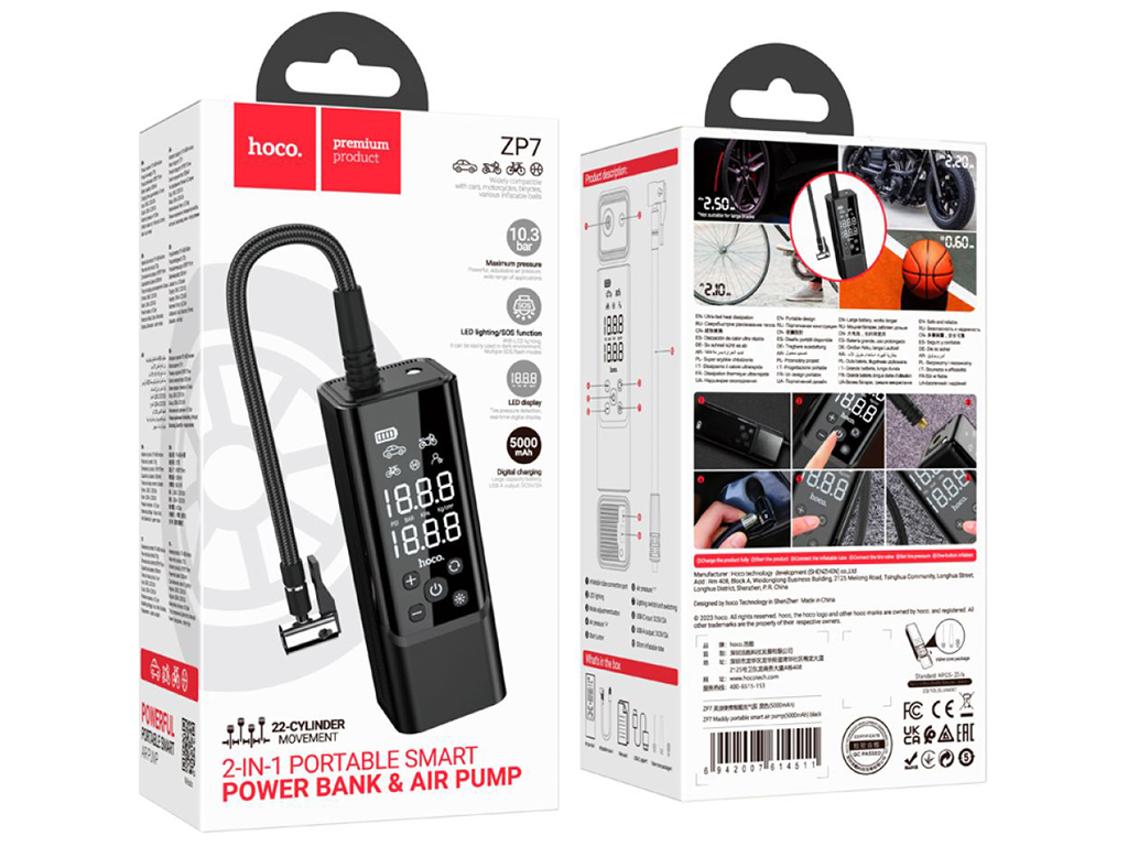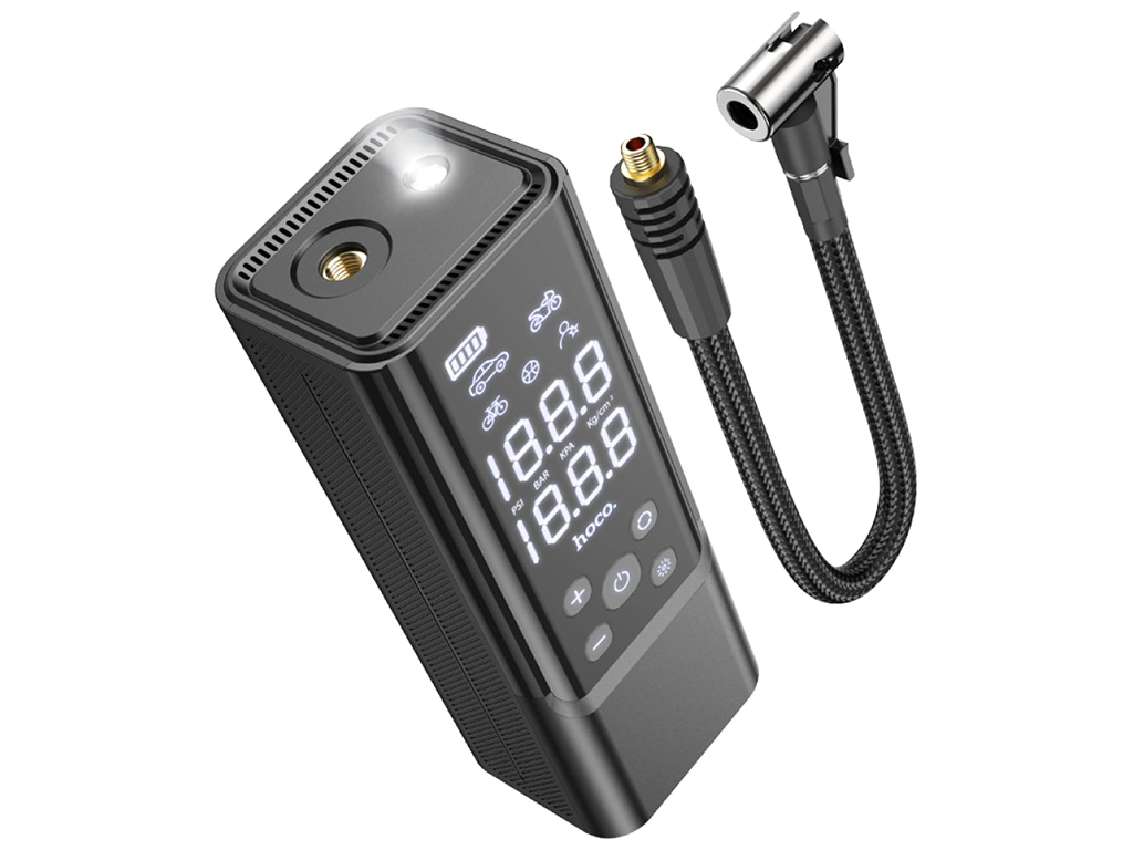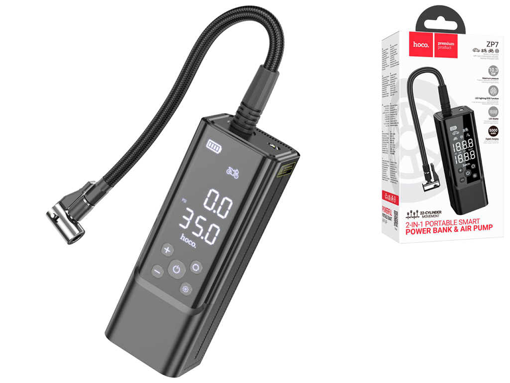 Автомобільний компресор Hoco ZP7 - це універсальний, функціональний пристрій, який стане справжньою знахідкою для автомобілістів і любителів активного відпочинку. Він допоможе легко, з мінімальними зусиллями накачати м'яч, човен, надувний матрац і шини більшості транспортних засобів, а також зарядити практично будь-який портативний гаджет. Крім того, він оснащений ліхтарем, що значно спростить виконання необхідних робіт в умовах недостатньої освітленості і буде корисним під час кемпінгу, нічних прогулянок і частих відключень електрики. Завдяки компактним розмірам, він з легкістю поміститься в бардачку автомобіля, ящику для інструментів або рюкзаку. Для виготовлення пристрою використовуються якісні електронні компоненти та міцні, зносостійкі матеріали: полікарбонат, ABS пластик, силікон. Рельєфні елементи його корпусу лаконічно поєднуються з глянцевими і матовими деталями, підкреслюючи його вишуканий дизайн. Ємність його енергоефективної батареї становить 5000mAh.