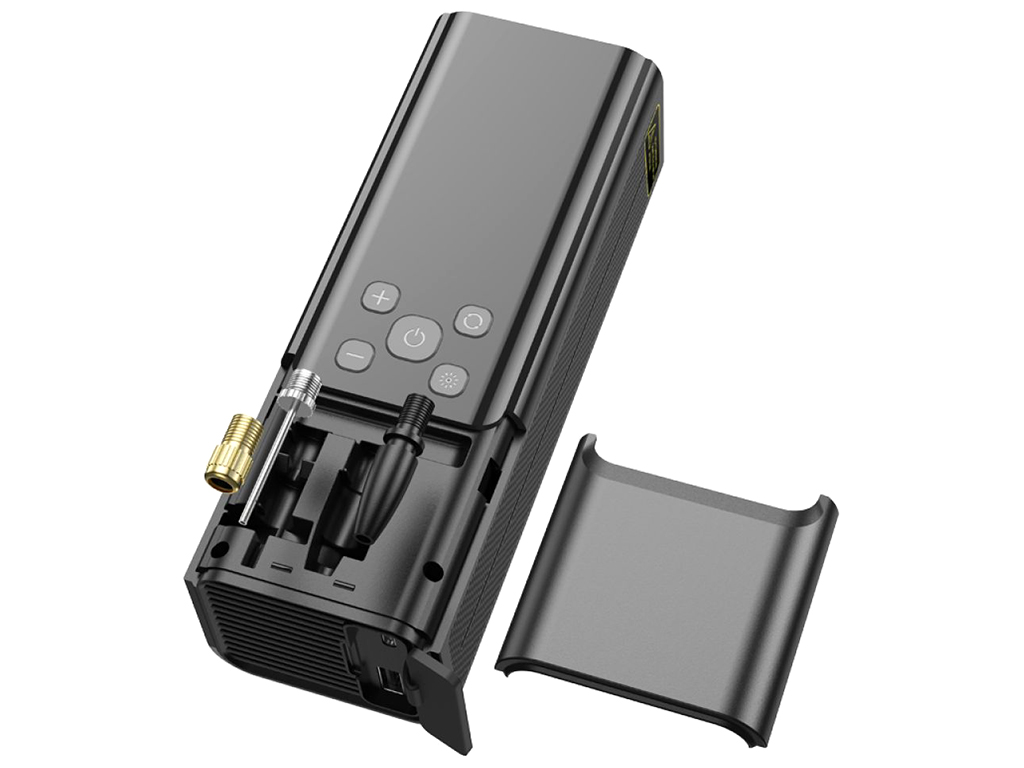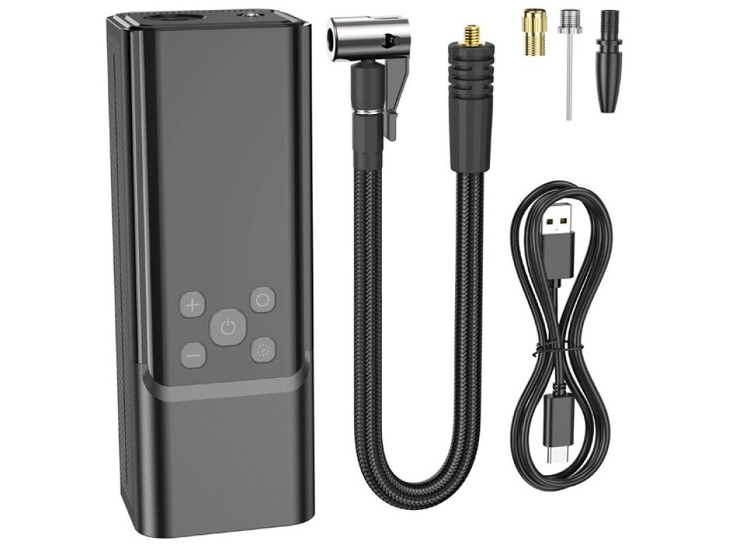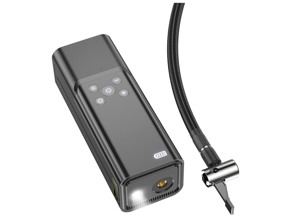 Кнопки та інформативний LED дисплей на його верхній панелі допоможуть контролювати рівень заряду, вибрати 1 з 4 попередньо встановлених режимів роботи та слідкувати за тиском у кількох одиницях виміру. В одному з його торців розташовані різьбовий конектор для гнучкої трубки компресора і ліхтар, а в другому - роз'єм Type-C для його заряджання і USB-порт для заряджання портативних гаджетів. Потужний щітковий двигун із 22 ходовими циліндрами дає змогу компресору створювати тиск до 10.3 бар. Він може безперервно працювати 15 хвилин і накачати шину 205/R16 всього за 9 хвилин. Практичною конструкцією пристрою передбачена можливість зберігання змінних насадок для трубки. Компресор комплектується інструкцією, кабелем Type-C, трубкою зі стандартним швидкознімним наконечником і трьома різними насадками. Вид акумулятора: Незнімний;