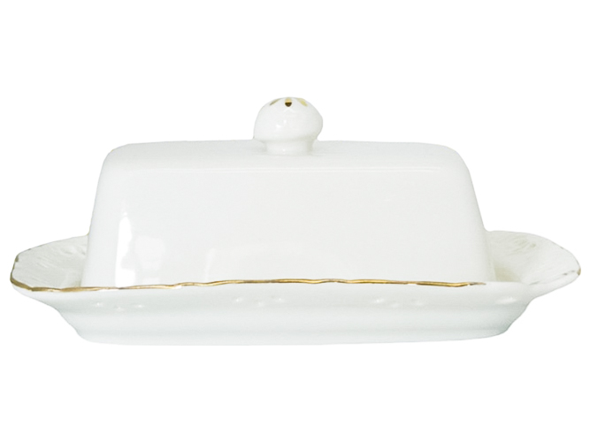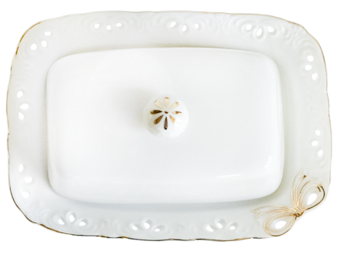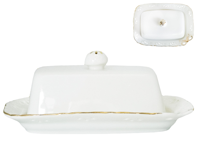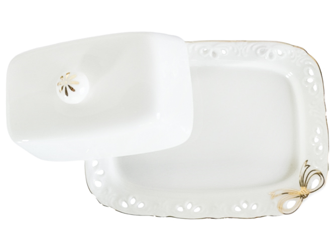 Маслянка Білий Бант для подачі і зберігання масла. Закривається щільно кришкою, запобігаючи вбирання маслом сторонніх запахів. Кришка зі зручною круглою ручкою для міцного захоплення, прикрашена декоративним малюнком. Матеріал: порцеляна.