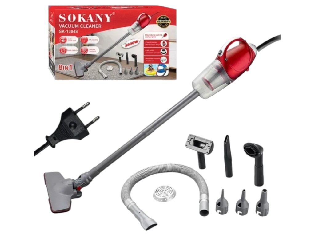 Призначений для сухого прибирання пилу, крихт та вовни з різних поверхонь у будинку та автомобілі. Оснащений пилозбірником об'ємом 1,7 літра та HEPA фільтром для тонкого очищення повітря. Дана модель від бренду Sokany може використовуватись як вертикальний, так і ручний пилосос. У комплект входить 8 насадок, включаючи щілинну, міні-насадку, насадку для килимів та круглу щітку. Пристрій підключається до мережі 220В та має довжину шнура 4 метри.