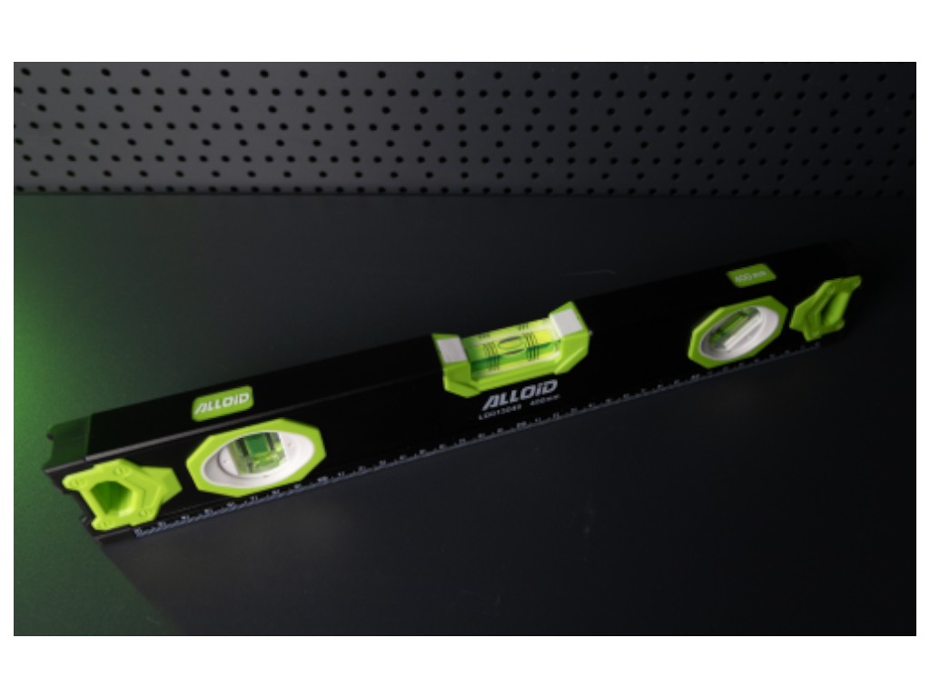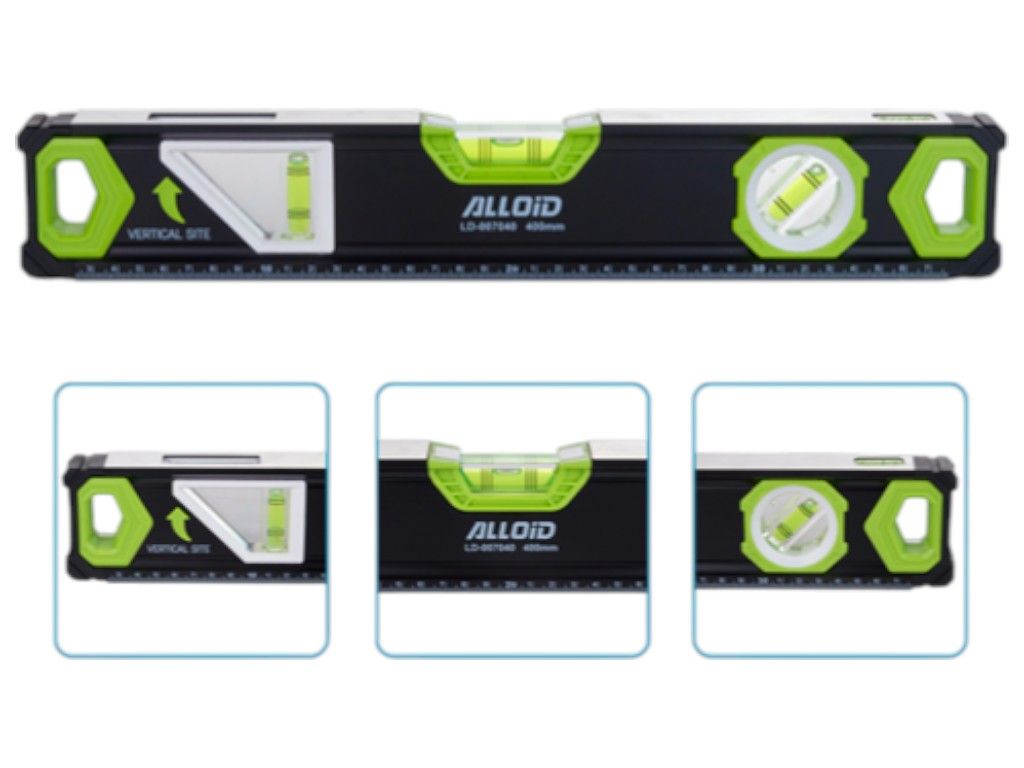 Точне зчитування вертикалі з бокового вікна, зручний контроль кутів завдяки трьом капсулам та впевнена фіксація на металі роблять цей інструмент зручним для монтажу в обмежених зонах. Корпус виконаний з анодованого алюмінію з прогумованими вставками, які гасять удари та забезпечують стійкість на гладких поверхнях. Магнітна основа полегшує роботу при розміщенні на металевих конструкціях. Нижня частина має міліметрову шкалу для точної розмітки. Модель Alloid Pro LD913402 застосовується в електромонтажі, ремонті, встановленні меблів та роботі з технікою.