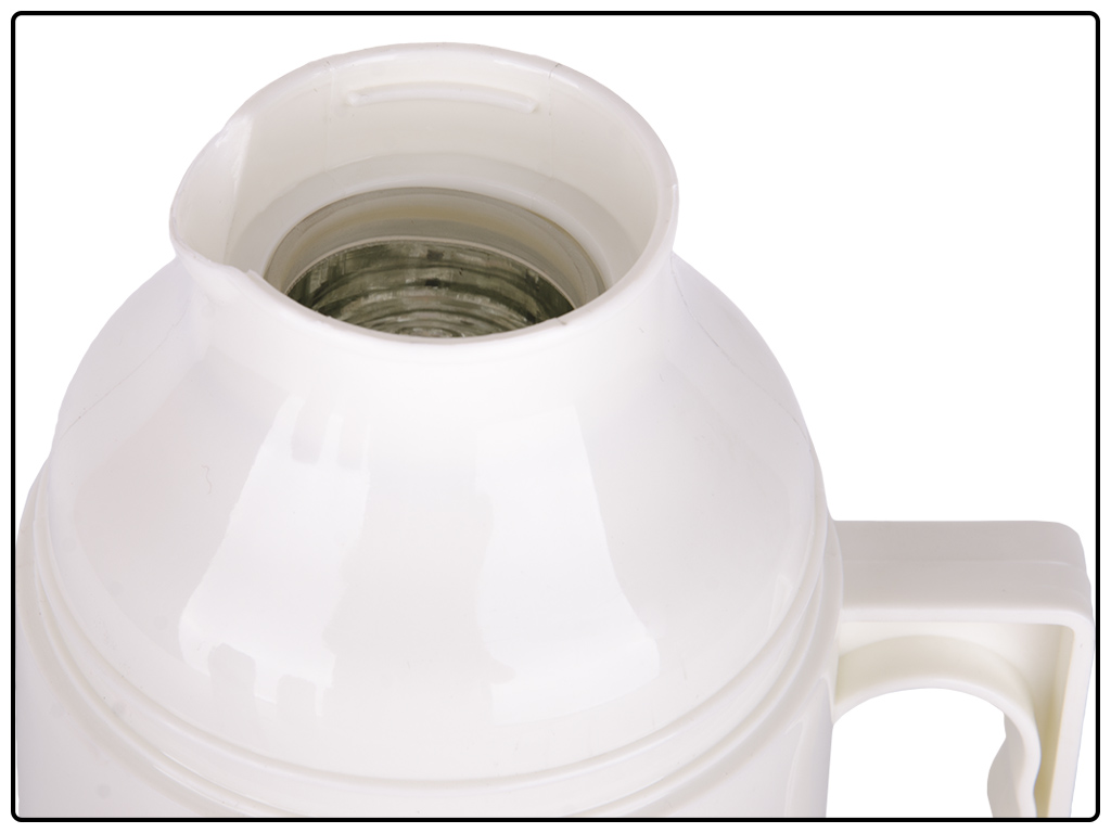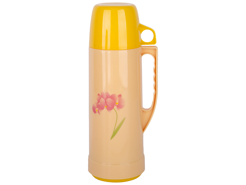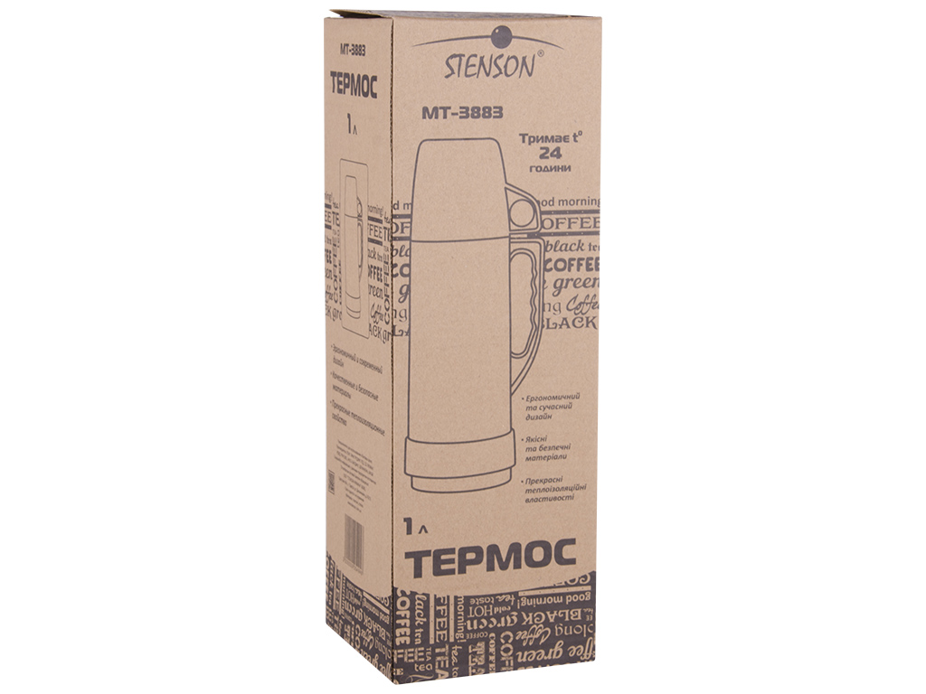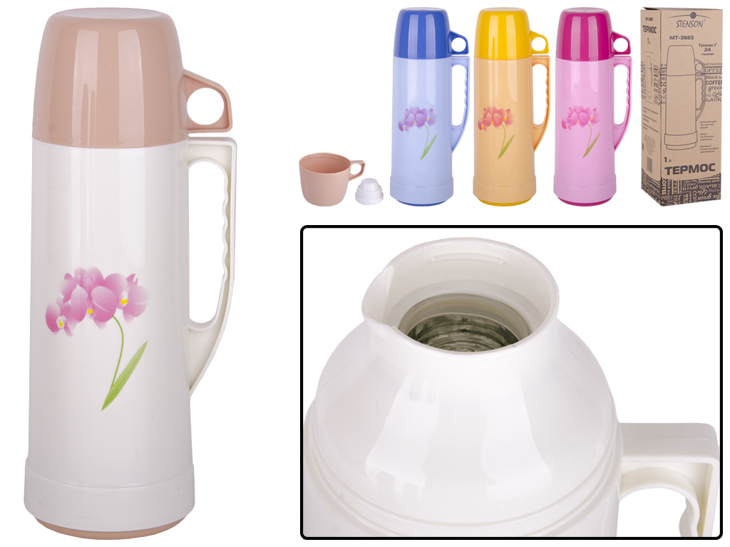 Об'єм: термос 1л, кришка-чашка 350мл. Розмір: 13,5х10,8х32см. Упаковка: коробка Kraft 11,5х11,5х33см. Матеріал: пластмаса - корпус, кришка, пробка; скло - колба. Кольори: синій, рожевий, бежевий, жовтий. Термос закривається гвинтовими пробкою і кришкою. Кришка обладнана ручкою і її можна використовувати в якості чашки. Корпус термоса оснащений ручкою для перенесення. Внутрішня колба виконана зі скла. Наявність термостійкого скла дозволяє забезпечити більш тривалий час температурного режиму. Так само матеріал не вбирає в себе смакові якості напоїв, що є значним плюсом.