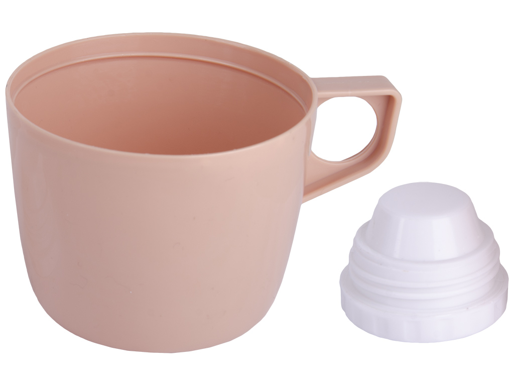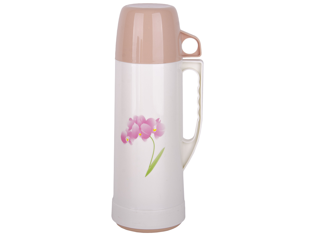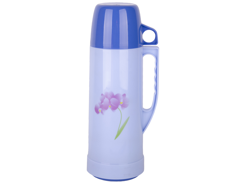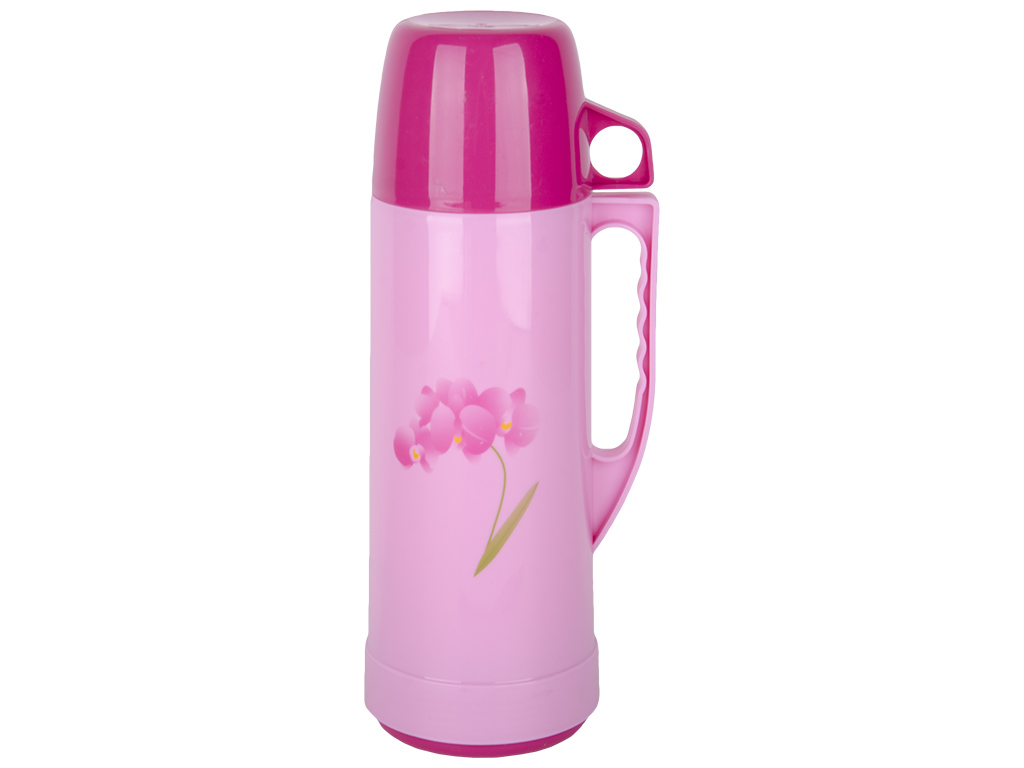 Об'єм: термос 1л, кришка-чашка 350мл. Розмір: 13,5х10,8х32см. Упаковка: коробка Kraft 11,5х11,5х33см. Матеріал: пластмаса - корпус, кришка, пробка; скло - колба. Кольори: синій, рожевий, бежевий, жовтий. Термос закривається гвинтовими пробкою і кришкою. Кришка обладнана ручкою і її можна використовувати в якості чашки. Корпус термоса оснащений ручкою для перенесення. Внутрішня колба виконана зі скла. Наявність термостійкого скла дозволяє забезпечити більш тривалий час температурного режиму. Так само матеріал не вбирає в себе смакові якості напоїв, що є значним плюсом.