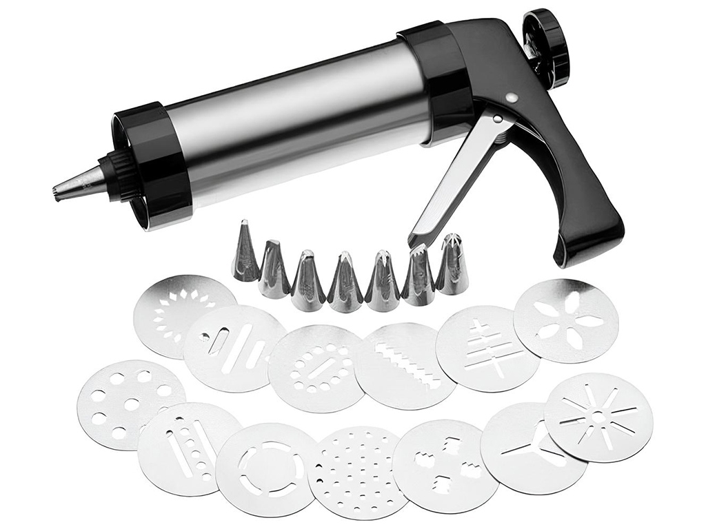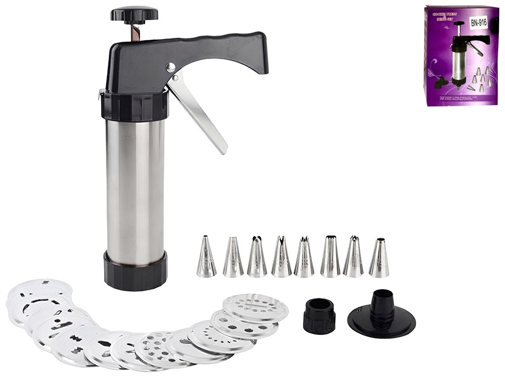 Пістолет для печива Benson працює як шприц дозатор для тіста, одночасно виконуючи функцію прес-форми для печива. Професійний кондитерський пістолет, який допоможе отримати різноманітне печиво ручної роботи в домашніх умовах або на невеликому кондитерському виробництві. Дуже міцний і легкий, зі спеціальним покриттям і дозатором. Дозатор дозволяє робити печиво великим розміром і маленьким. Повертаєте регулятор на 180 градусів і можете самі задавати потрібний Вам розмір (великий і маленький розмір печива) - чудовий інструмент, який полегшує і прискорює процес випікання печива, бісквітів, пряників і т. д. Великий вибір насадок дає змогу творчо підійти до випікання, десерту або іншої кулінарної вишуканості та створити неповторні шедеври, що вирізняються своєю оригінальністю. Виготовлений із високоякісної неіржавкої сталі, що гарантує довговічність і безпеку. Насадки з декоративними рельєфними візерунками призначені для крему та печива.