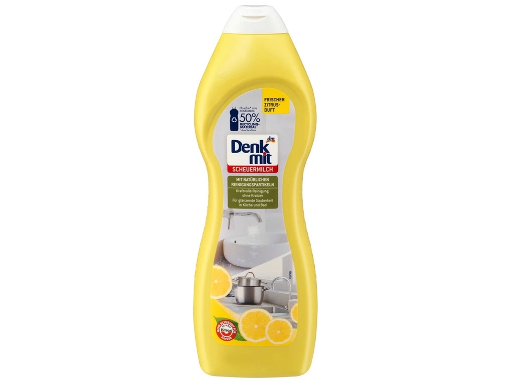 Чистяче молочко Denkmit забезпечує блискучу чистоту в кухні та ванній кімнаті. Його потужна формула видаляє навіть найстійкіші забруднення, не залишаючи подряпин. Натуральні полірувальні тіла, що містяться в ньому, забезпечують ефективне і дбайливе очищення поверхонь. Це молочко ідеально підходить для умивальників, унітазів, кахлю, плит, робочих поверхонь, раковин, каструль і сковорідок, гарантуючи блискучу чистоту.
