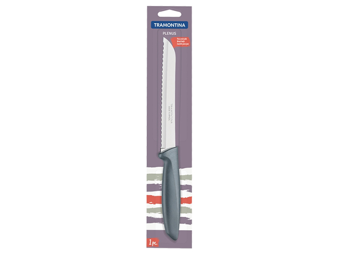 Ніж для хліба Tramontina Plenus Grey, 17,8см. Упаковка: індивідуальний блістер. Матеріал леза: нержавіюча сталь AISI 420. Матеріал ручки: поліпропілен. Ріжуча край ножа: зубчаста. Колір: сірий.