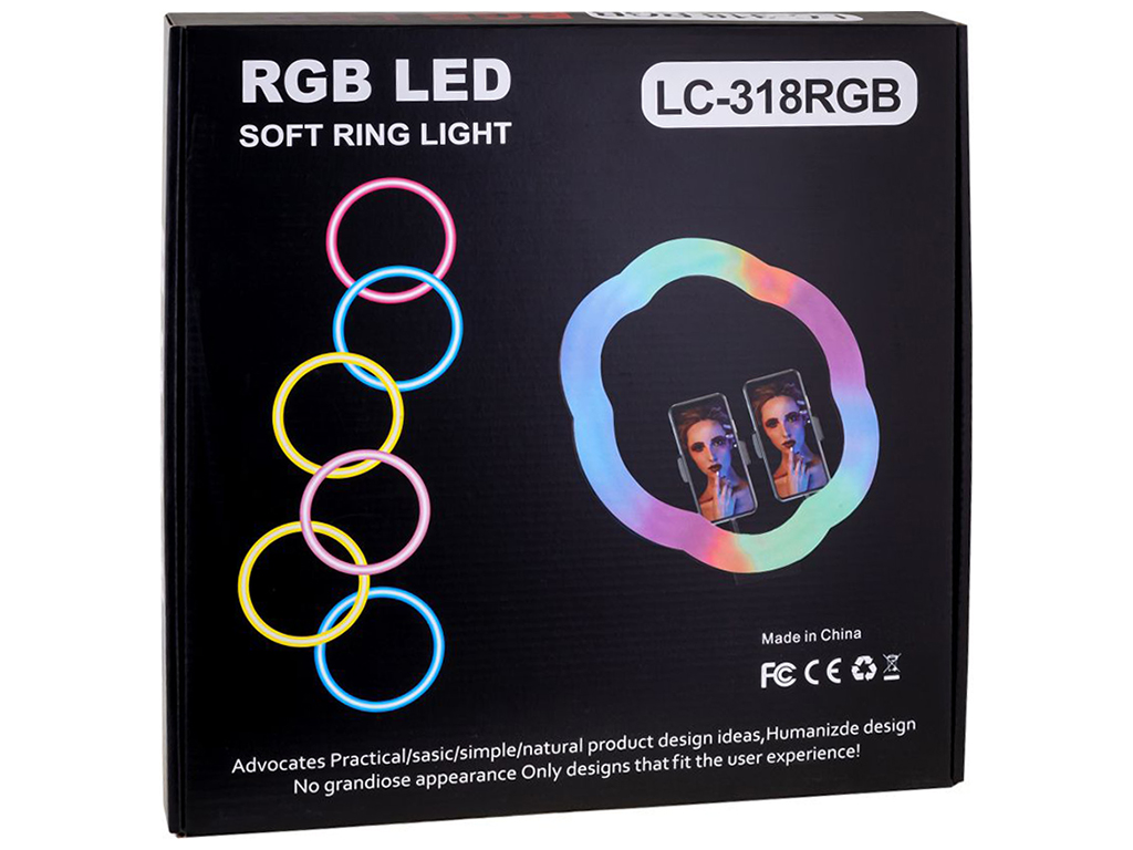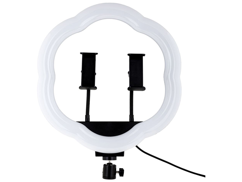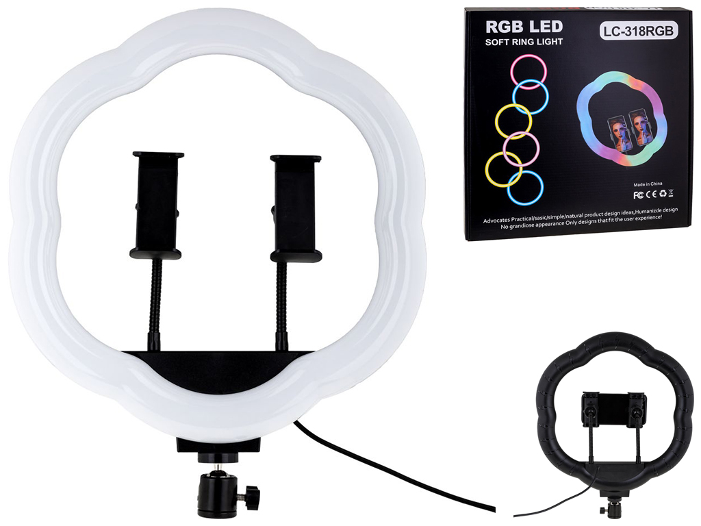 Лампа RGB LC-318 (Flower Type) 36 см - це доступне кожному професійне висвітлення для фото і відео зйомки, додаткового освітлення. Пристрій реалізований в оригінальній формі, виконаної за типом квітки з зовнішнім діаметром 33 см. Модель здатна працювати в більш ніж 10 режимах, наприклад, світити різними кольорами окремо, що переливаються по колу кольоровими градієнтами і сегментами. Корпус аксесуара виготовлений з міцного пластику, має надійну збірку. Зручний пульт допоможе включити лампу, легко вибрати необхідний режим і змінити яскравість. Конструкцією пристрою передбачена можливість кріплення камер або, що входять в комплект, тримачів для смартфона, при цьому шарнірний механізм дозволить регулювати поворот утримуваного гаджета на необхідний кут. До мережі лампа підключається за допомогою надійного кабелю з роз'ємом USB.