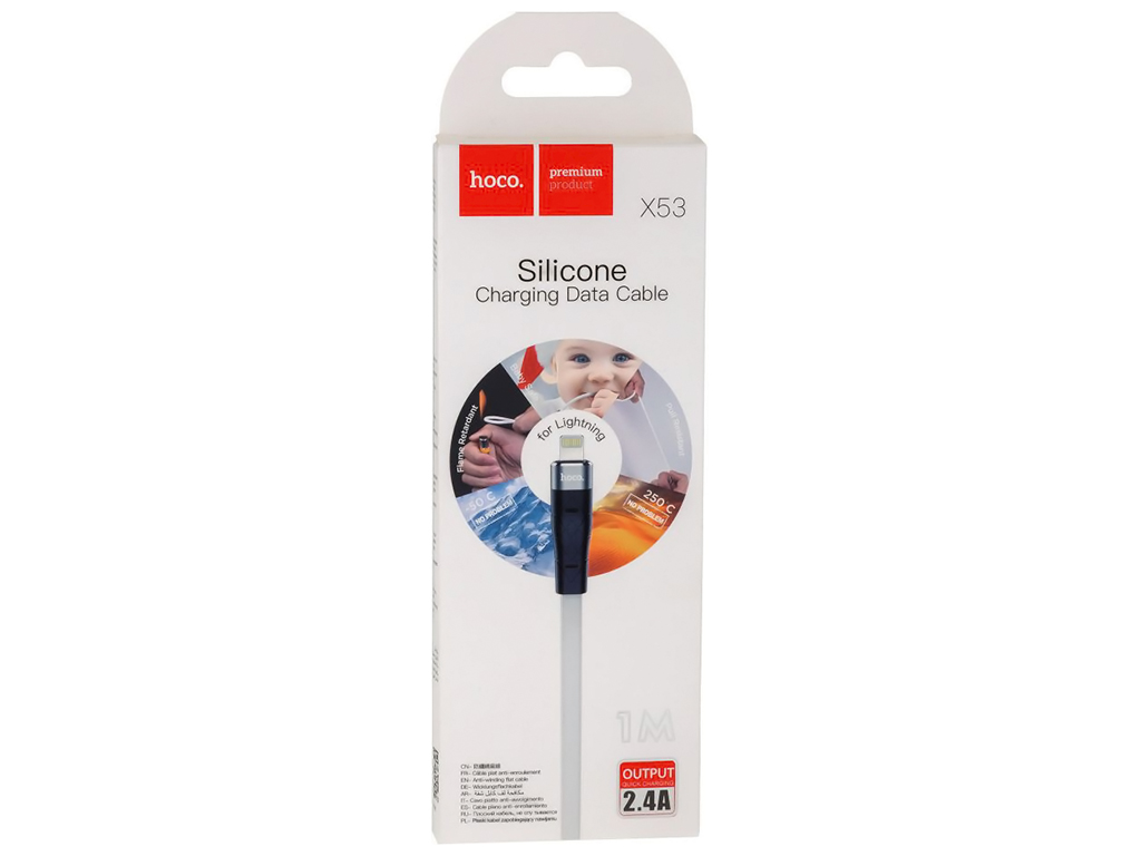 Кабель USB Hoco X53 Angel Lightning - преміум пропозиція з винятковим дизайном. Аксесуар може використовуватися як для зарядки гаджетів, так і для їх підключення до ПК для синхронізації. Корпуси конекторів виготовлені з використанням алюмінієвого сплаву і пластика, мають приємну на дотик, рельєфну поверхню, утворену тисненими геометричними фігурами. Міцне обплетення виконане з абсолютно безпечного для людини харчового силікону, запобігає сплутування кабелю, здатне захистити його від більшості можливих пошкоджень. Плоскоовальний перетин кабелю забезпечує його тривалу функціональність. Сердечник з 118 проводів з чистої міді в поєднанні з якісним екрануванням гарантує стабільний струм, напругу і швидкість передачі даних. Максимальна сила проведеного струму становить 2.4а. Довжина кабелю - 1м. Встановлення з'єднання між пристроями здійснюється через USB - Lightning.