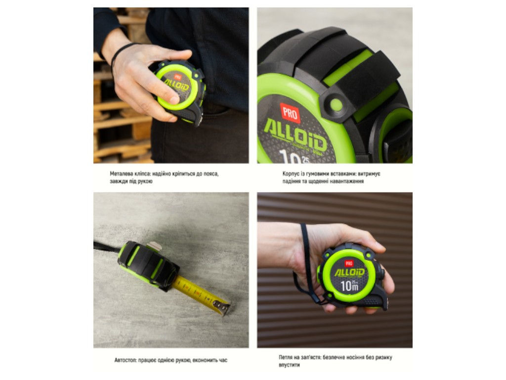 Сталева стрічка шириною 25 мм витримує великі прольоти без прогину, забезпечуючи точні виміри на будівельних та ремонтних об'єктах. Автоматична фіксація полегшує роботу однією рукою, а прогумований корпус амортизує удари при падіннях. Кліпса для пояса та петля для зап'ястя забезпечують зручність при перенесенні.