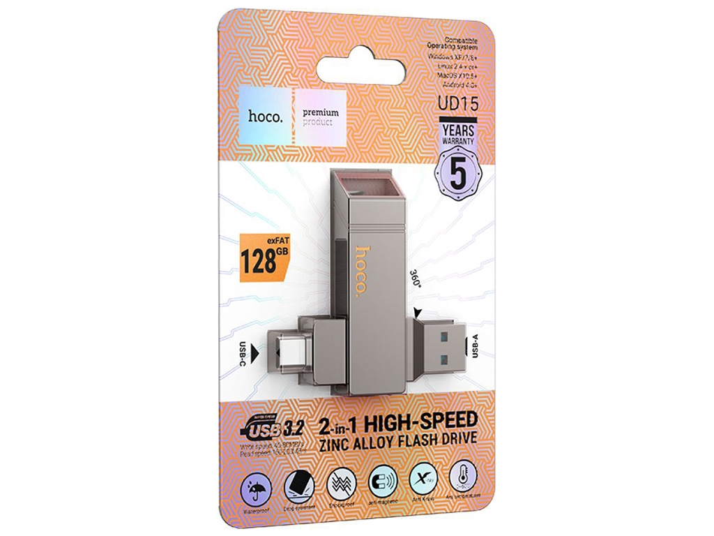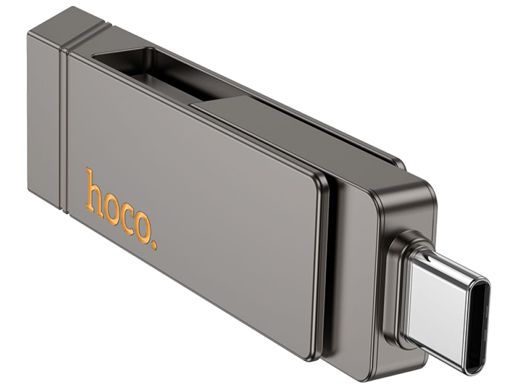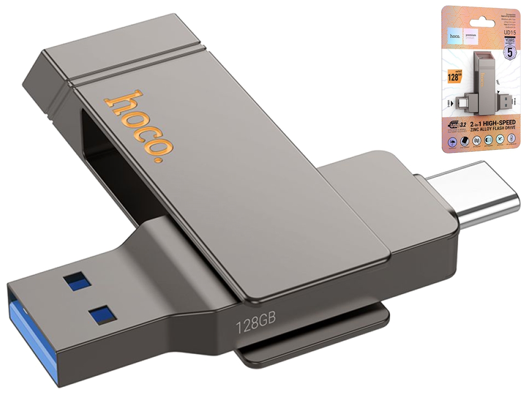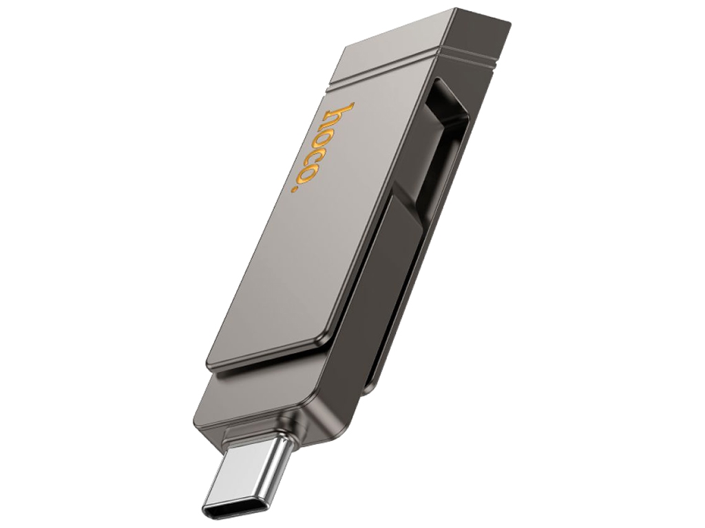 USB Flash Drive Hoco UD15 Clever - це високошвидкісний, універсальний носій інформації, який виділяється сумісністю з величезною кількістю сучасних пристроїв: від смартфонів і планшетів до комп'ютерів і ТВ приставок. Аксесуар реалізовано в стильному дизайні з оригінальними, практичними деталями і строгими, прямими лініями. Завдяки компактним розмірам і надійній петельці, його зі зручністю можна носити з собою навіть у гаманці та використовувати як брелок. Корпус флешки виготовлено з легкого, але надзвичайно міцного цинкового сплаву, захищено від води, магнітного та рентгенівського випромінювань, ударів і високих температур. Його виняткова надійність забезпечує безпеку поміщених на нього даних і підтверджується п'ятирічною гарантією від виробника. Зовнішня рамка корпусу може обертатися на всі 360° навколо його осі та прикривати один із двох роз'ємів.