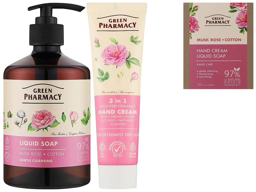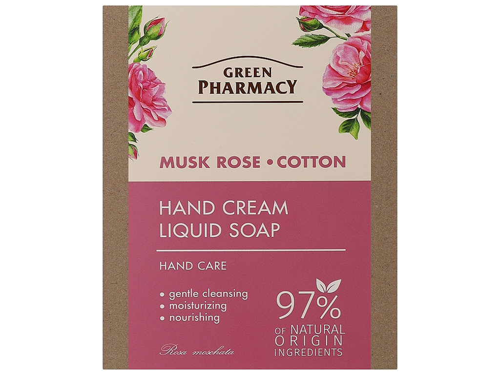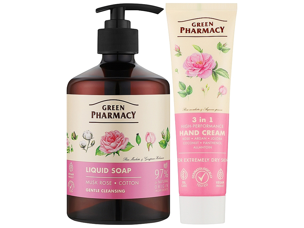 Косметичний набір розроблений для щоденного догляду за шкірою рук. Крем має легку текстуру, швидко вбирається, збагачений маслом троянди, екстрактом бавовни та активними компонентами для живлення, захисту та регенерації шкіри. Рідке мило зручно дозується, утворює щільну піну, делікатно очищає та надає шкірі еластичність. Обидва засоби мають приємний квітковий аромат. Формула містить рослинні інгредієнти, а сама серія Green Pharmacy орієнтована на м'який догляд із антиоксидантною дією.