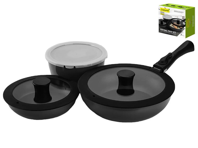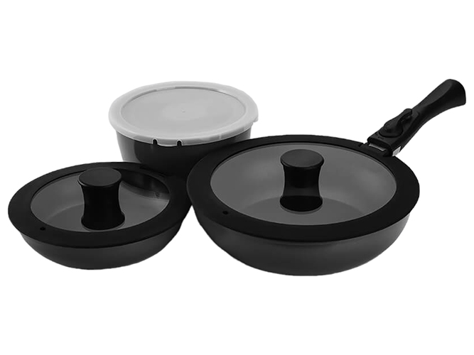 До складу набору входять: ківш з кришкою, діаметр: 18см, висота: 9см. Сковорода універсальна з кришкою, діаметр: 20см, висота: 4,5см. Сковорода WOK з кришкою, діаметр: 26см, висота: 7см. Знімна ручка з фіксатором для сковорідок. Матеріл сковорід, ківша: алюміній. Матеріал ручки: пластик з силіконовим покриттям. Матеріал кришки ківша: пластик