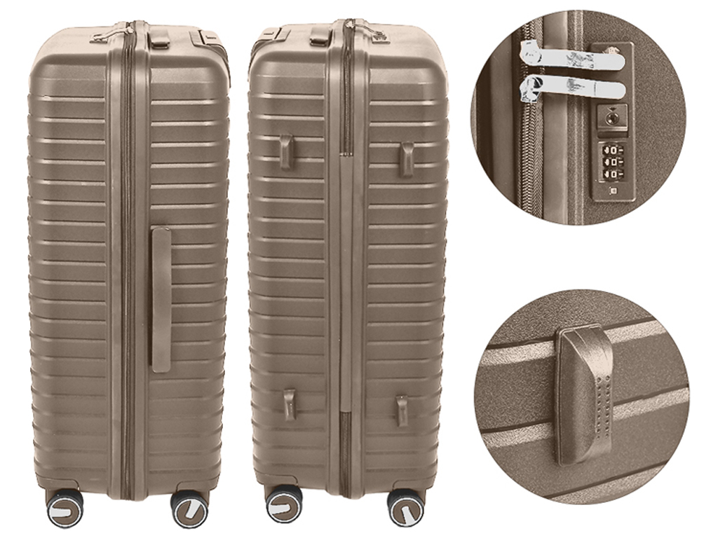 Набір валіз із поліпропілену (PP) бежевого кольору — надійний супутник для будь-якої подорожі. У комплекті три валізи різних розмірів: 19", 23" і 27" — від ручної поклажі до місткої дорожньої валізи. Поліпропіленовий корпус стійкий до механічних пошкоджень і водночас легкий.