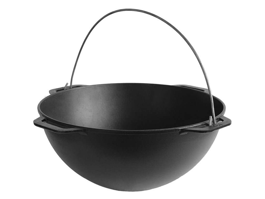 Транспортувальний розмір (гофрокороб): 43х43х21,5см. Об'єм: 15л. Товщина дна: 4,5мм. Товщина стінки: 3,8мм. Вага: 12,1кг. Матеріал: чавун. 4 ручки у казана, 2 ручки на кришці. Без коробки. Безпечний і екологічно чистий посуд. Володіє природним антипригарним покриттям. Збагачує їжу залізом. Має необмежений термін експлуатації. Підходить для всіх видів плит. Укомплектований дужкою і чавунною кришкою-гриль. Призначений для приготування страв на багатті або мангалі, що вимагають гасіння, томління і приготування у власному соку. Товсті стінки і напівсферичне дно акумулюють тепло по всій поверхні казана, і сприяють рівномірному приготуванню їжі. М'ясо, плов та інші страви, приготовані в казані з чавуну, по-особливому смачні, соковиті і мають просто неймовірний насичений аромат. Чавунний казан стійкий до пошкоджень. Незамінний помічник в поході, на дачі і відпочинку на природі.