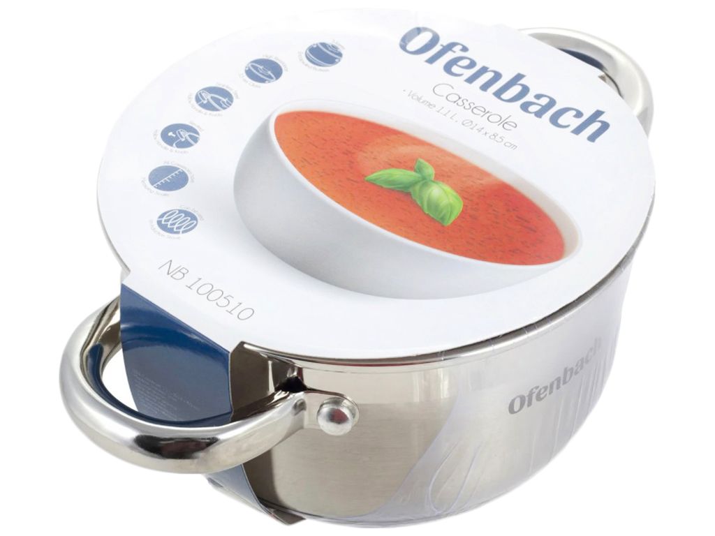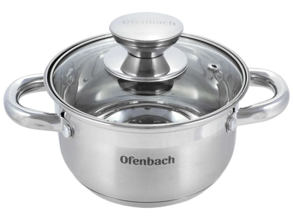 Об'єм: 1,1л. Діаметр: 14см. Висота: 8,5см. Матеріал: сталь нержавіюча. Матеріал кришки: термостійке скло. Підходить для всіх типів плит і посудомийної машини. Каструля Ofenbach - потрібна і незамінна річ на Вашій кухні. Виконана з якісних матеріалів з використанням сучасних технологій виробництва. Така каструля має прекрасний зовнішній вигляд, оснащена 5-шаровим капсульної дном і відрізняється високою міцністю і довговічністю у використанні. Завдяки своїм ергономічним властивостям, каструля буде служити Вам дуже довго і принесе тільки задоволення від використання.