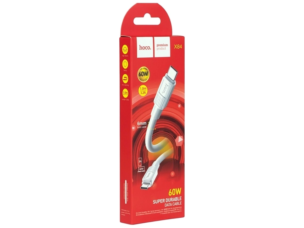 Кабель USB Hoco X84 60W Type-C - універсальний аксесуар, який підтримує передачу даних, може використовуватися для заряджання смартфонів, планшетів і навіть ноутбуків. Модель реалізована в стильному, практичному дизайні, пропонується у двох класичних кольорах: у чорному та білому кольорах. Виняткова надійність даного кабелю гарантує його тривалий термін служби та безпечний процес заряджання. Нерозбірні корпуси конекторів виготовлені з полівінілхлориду, виконані у зручній формі та мають приємну на дотик поверхню, що зробить експлуатацію аксесуара максимально комфортною. Для виготовлення зовнішньої обплетення кабелю також використовується полівінілхлорид, завдяки якому вона одночасно має жорсткість і еластичність, стійкість до розривів і розтягування, перешкоджає сплутуванню. Потовщений сердечник кабелю діаметром 6мм складається із 118 жил, що дозволяє йому витримувати потужність до 20Вт. Встановлення з'єднання між пристроями здійснюється через Type-C – Type-C. Довжина кабелю – 1м.