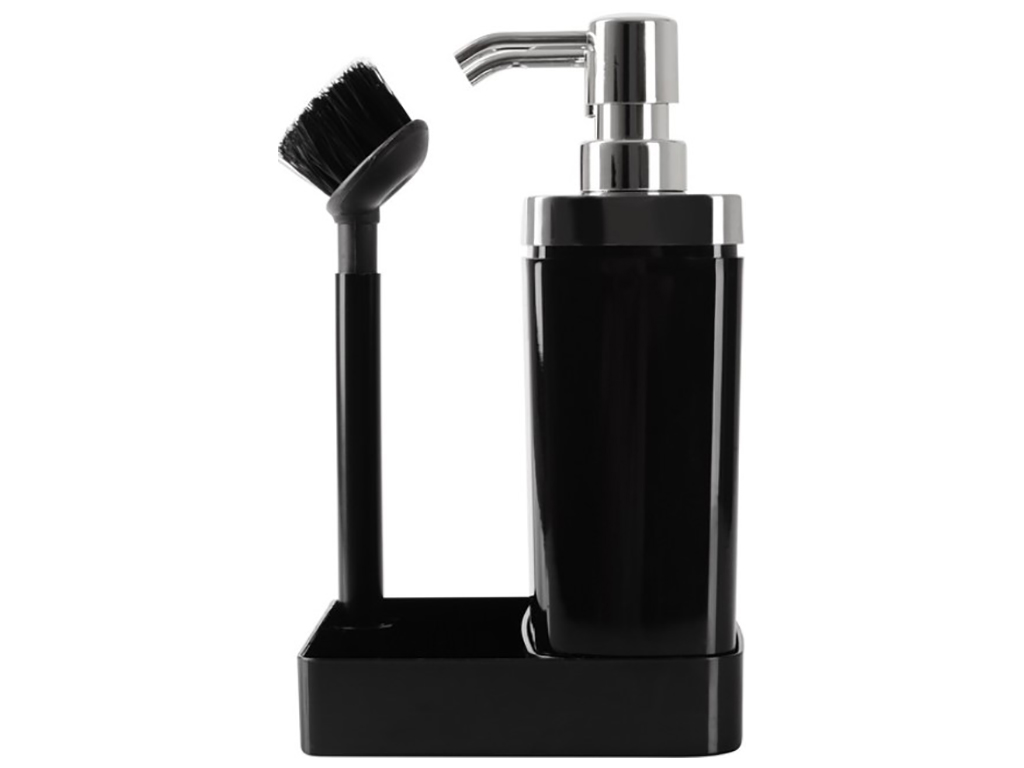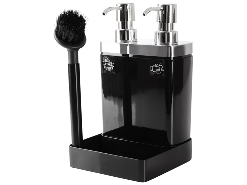 Кухонний набір з подвійним дозатором це ідеальне рішення для зручного та гігієнічного миття посуду. Цей набір складається з двох дозаторів для рідини та щітки для миття посуду. Дозатори можна використовувати для зберігання рідини для миття посуду та рідкого мила, що дозволяє ефективно організувати простір на кухні. Ергономічна форма щітки забезпечує легкість використання та комфорт, що полегшує процес миття посуду. Набір виконаний у стильному чорному кольорі з хромованими елементами, що додає сучасності та елегантності будь-якій кухні. Матеріал виготовлення - високоякісний пластик, стійкий до механічних пошкоджень та впливу миючих засобів. Компактний дизайн дозволяє розмістити набір на кухонній стільниці, не займаючи багато місця, а спеціальна підставка забезпечує стійкість і чистоту, утримуючи всі предмети на своїх місцях. Можна мити в посудомийній машині. Матеріал: пластик. Форма: прямокутна.