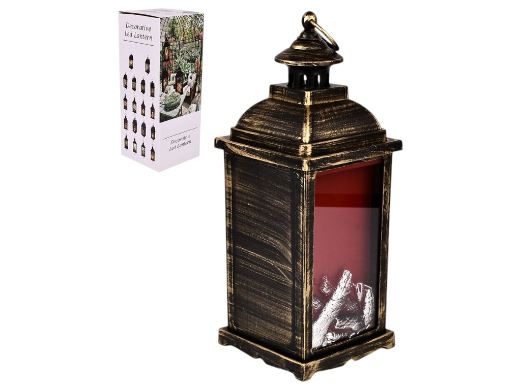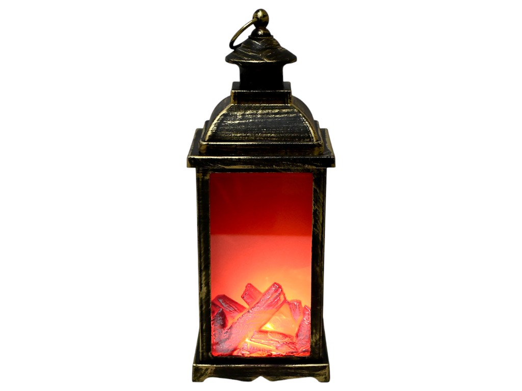 Декоративний світильник у формі ліхтаря з LED підсвічуванням створює ефект дрів, що тліють, і використовується як елемент інтер'єрного освітлення. Живлення можливе як через USB, так і від трьох батарейок типу AAA. Корпус із пластику оформлений у вінтажному стилі та оснащений металевою петлею для підвішування.