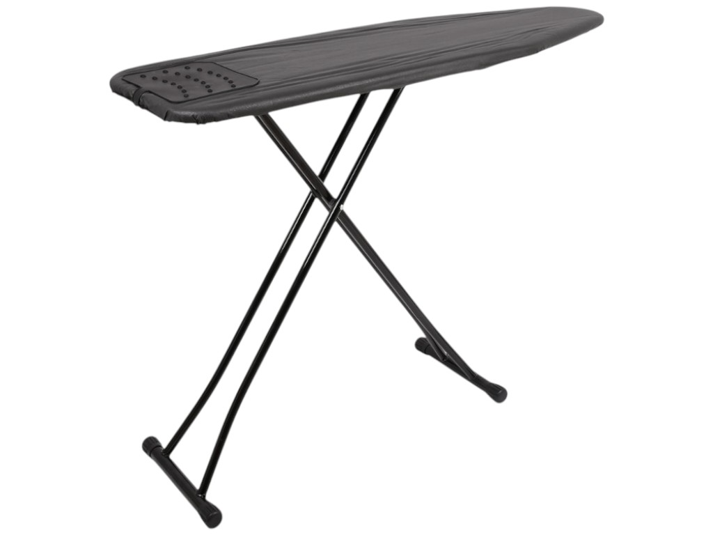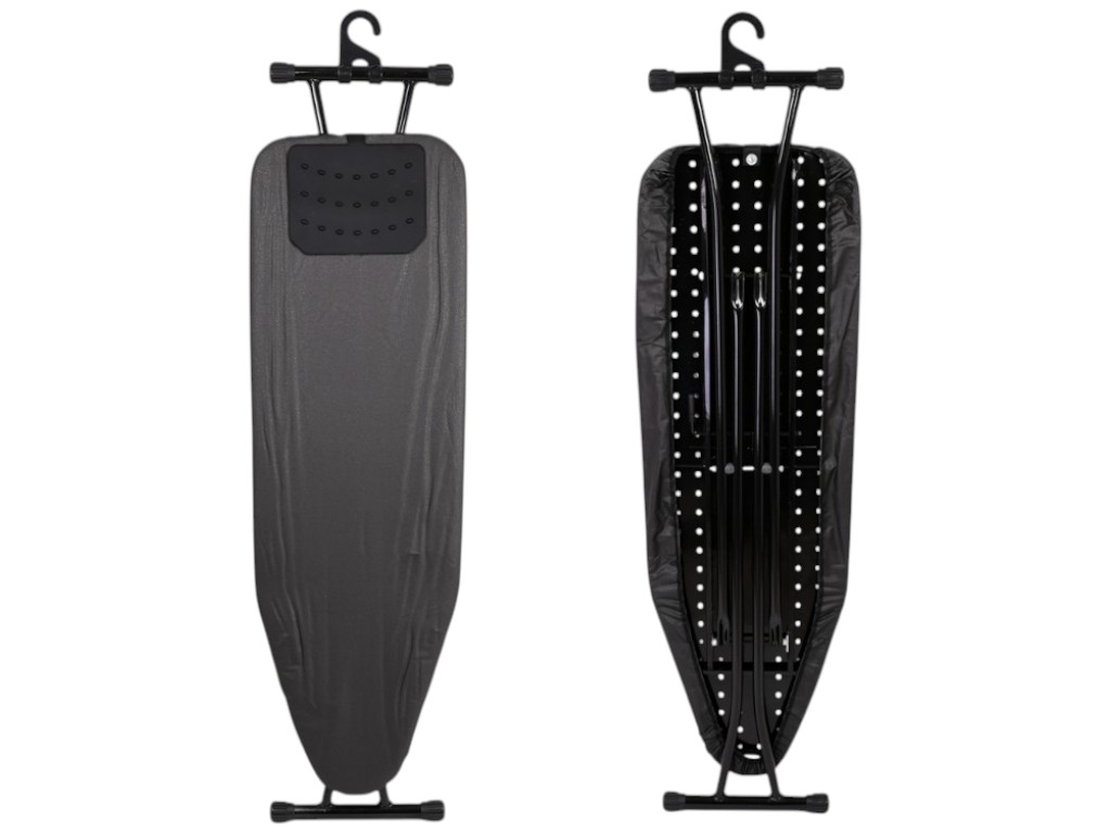Ця модель поєднує стійкість, простоту й акуратний зовнішній вигляд. Основа із суцільного металевого листа з рівномірними перфораціями створює рівну поверхню, крізь яку вільно проходить пара, а тканина після прасування залишається сухою та без відбитків. Робоча зона оптимальна для домашніх умов: вистачає місця для сорочок, штанів, скатертин і постільної білизни, а переставляти виріб потрібно менше. Каркас виконаний із посилених сталевих труб із матовим покриттям, стійким до вологи та подряпин. Висота регулюється покроково, тому можна обрати комфортне положення для прасування сидячи або стоячи. На торці розташований термостійкий майданчик із силіконовими виступами — праска стоїть стабільно, не ковзає, а підошва не торкається тканини. Уся конструкція складається одним рухом, фіксується засувкою та зберігається вертикально, не займаючи зайвого простору. Кронштейн у верхній частині служить зручним підвісом для дверцят або гардеробної. Поверхня чохла виготовлена зі щільної термостійкої тканини з легким блиском — вона не вигорає, витримує пару та швидко висихає. Під час роботи дошка впевнено стоїть на місці: опори Т-подібної форми з прогумованими заглушками гасять вібрацію та не ковзають навіть на гладкій підлозі. З парогенератором побутового рівня конструкція справляється без зусиль — потік проходить крізь отвори, а тепло розподіляється по всій площині без конденсату. Для делікатних тканин підходить щадний режим: рівна поверхня без сітки унеможливлює відбивання швів. Після прасування виріб легко очистити — каркас протирають м'якою тканиною, а чохол можна зняти і випрати вручну при температурі до тридцяти градусів. У повсякденному ритмі дошка заощаджує час і зберігає лад: вранці зручно пропрасувати одяг перед виходом, увечері — швидко пройтися по постільній білизні. Компактна конструкція без зайвих деталей впишеться навіть у маленьку квартиру, а при зберіганні у вертикальному положенні не вимагає окремого місця. Упакована у плівку ПВХ, що захищає виріб від пилу та дрібних подряпин при транспортуванні. Строгий сірий колір підкреслює універсальний стиль — дошка підходить як для дому, так і для мініготелю чи орендованого житла.