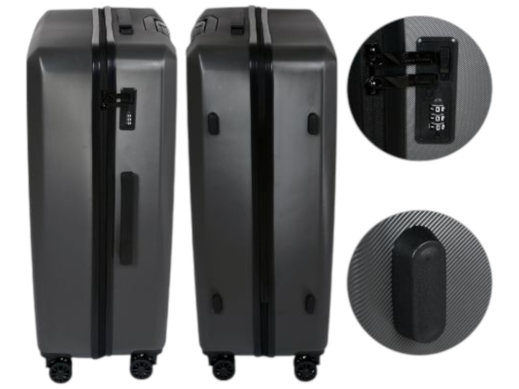 Набір валіз складається з трьох виробів розміром 20, 24 та 28 дюймів. Корпус виконаний із міцного пластику з легкою матовою фактурою, стійкою до подряпин. Внутрішня частина оздоблена щільною тканиною, має ремені для фіксації речей та окремий відсік на блискавці для дрібних предметів. Телескопічна металева ручка регулюється за висотою та зручно складається під час зберігання. Поворотні колеса обертаються на 360 градусів і забезпечують плавне пересування. На кожній валізі встановлений вбудований кодовий замок для захисту вмісту. Молодша модель підходить для ручної поклажі, середня та велика — для відряджень і подорожей. Вироби можна вкладати одне в одне, економлячи місце вдома. Матеріали не схильні до впливу вологи та зберігають форму під навантаженням. Поверхня очищується м’якою вологою серветкою.