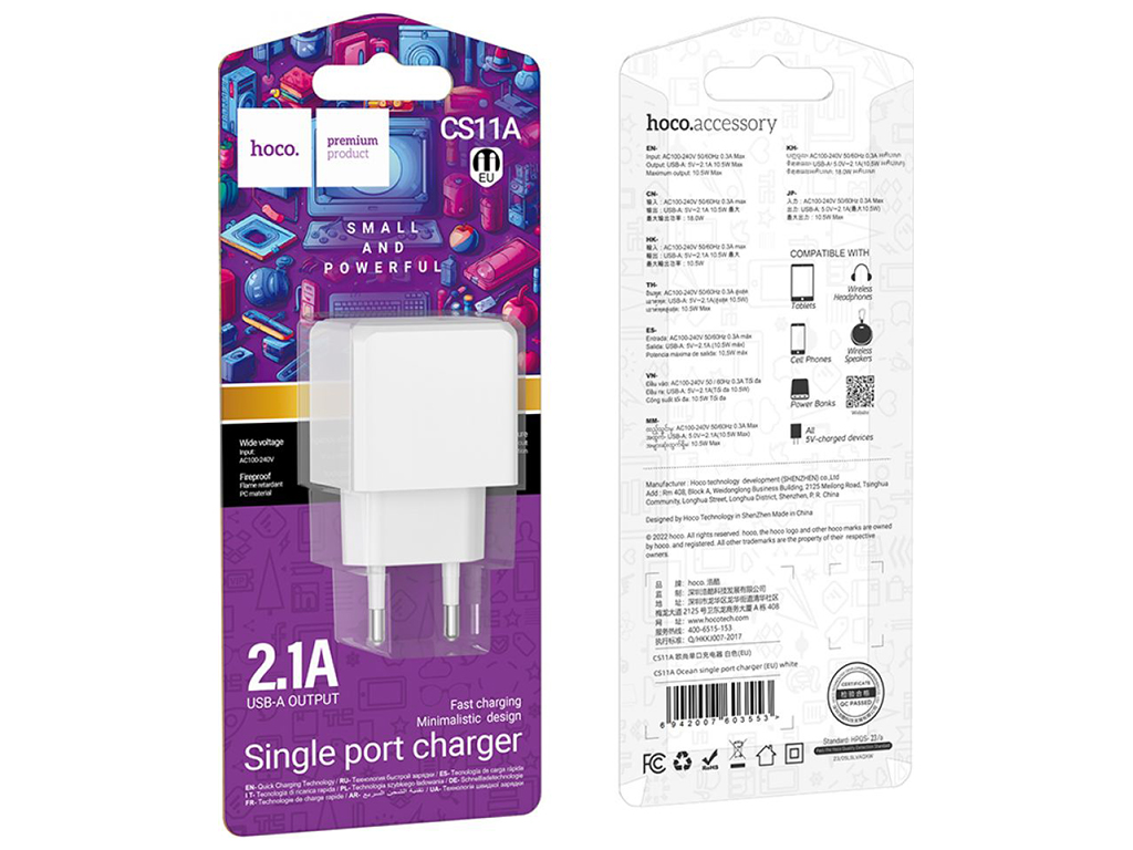 Мережевий Зарядний Пристрій Hoco CS11A 1USB 2.1A Колір Білий