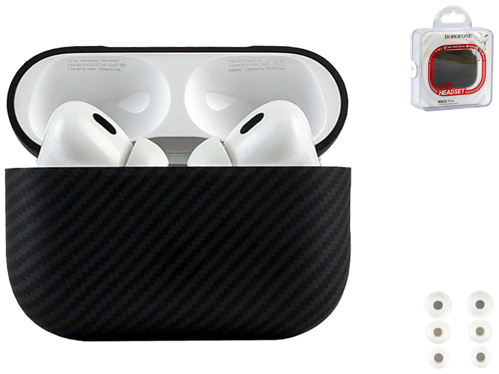 Оригінальний зарядний кейс із приємною на дотик поверхнею - стильною текстурою карбонового волокна. Ергономічна форма з силіконовими амбушурами для забезпечення зручної посадки з ізоляцією від стороннього шуму. Відтворення якісного звуку з чистими високими та насиченими середніми частотами, а також глибокими басами. Чутливий мікрофон і технологія бінауральної розмови для максимально комфортного здійснення дзвінків. Функціональне сенсорне керування, чутливе до сили натискання, для зручного приймання дзвінків, перемикання треків і багато іншого. Підтримка виклику голосового помічника і перемикання ведучий/ведений з можливістю використання одного навушника. Модуль Bluetooth V5.3 (чип Jerry AC6983) для забезпечення стабільного бездротового з'єднання з низькою затримкою і низьким енергоспоживанням. Близько 4 годин роботи в активному режимі та 150 годин у режимі очікування. Зарядний кейс із магнітною кришкою, батареєю ємністю 300mAh і роз'ємом Lightning для зарядки.