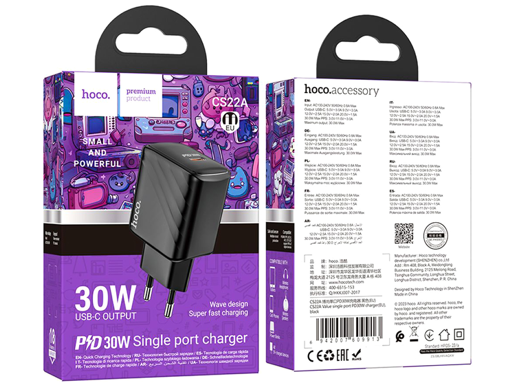 Мережевий зарядний пристрій Hoco CS22A 1USB-C PD/QC 30W, Колір Чорний