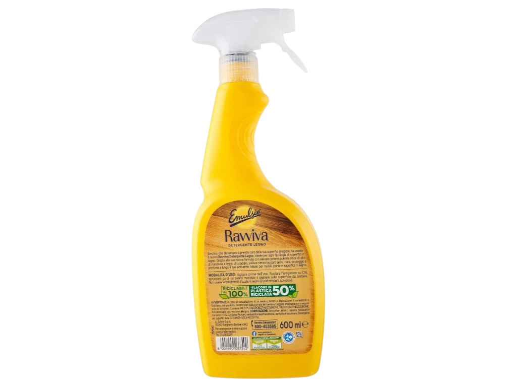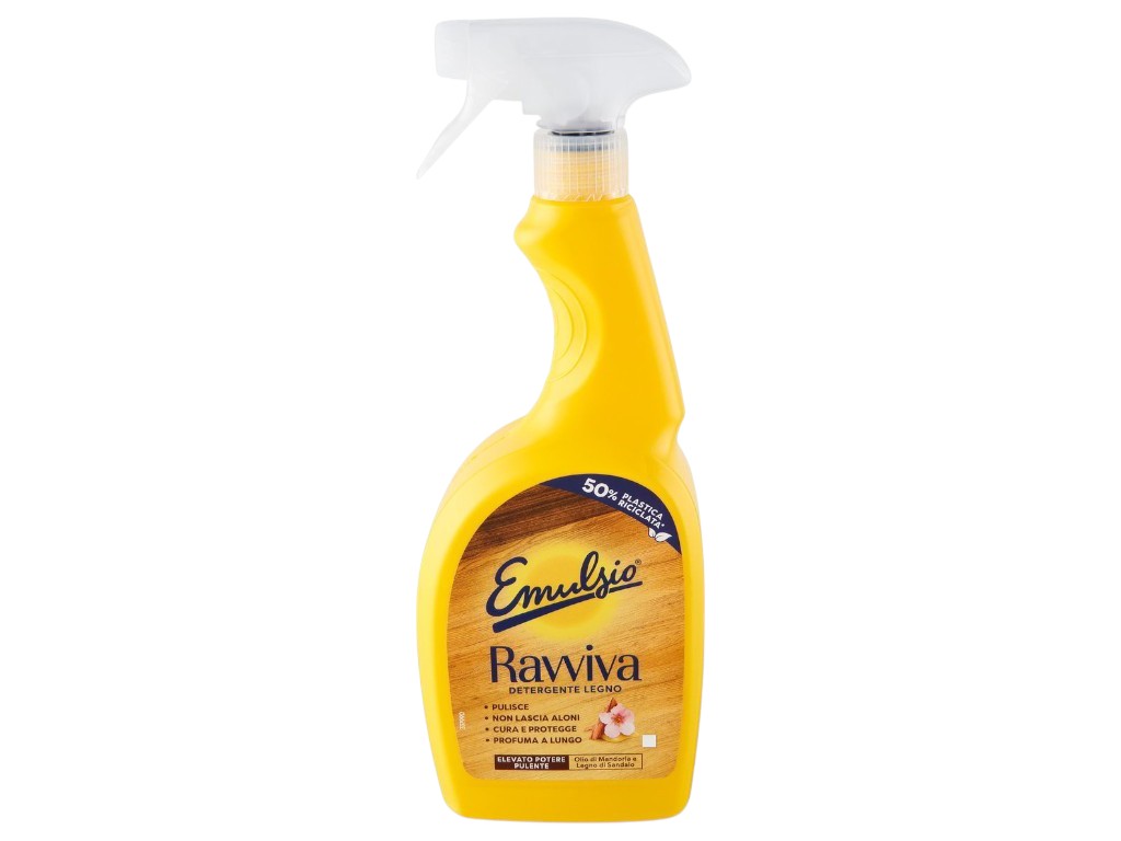 Emulsio Ravviva Legno — це ефективний засіб для догляду за меблями та дерев'яними поверхнями. Підходить для всіх типів дерева, включно з лакованими та делікатними. Завдяки оновленій формулі продукт глибоко очищає, доглядає за деревиною, надає блиску та забезпечує тривалий захист. Залишає приємний аромат квітів франжипані. Не залишає розводів. Флакон виготовлений з 50% переробленого пластику.