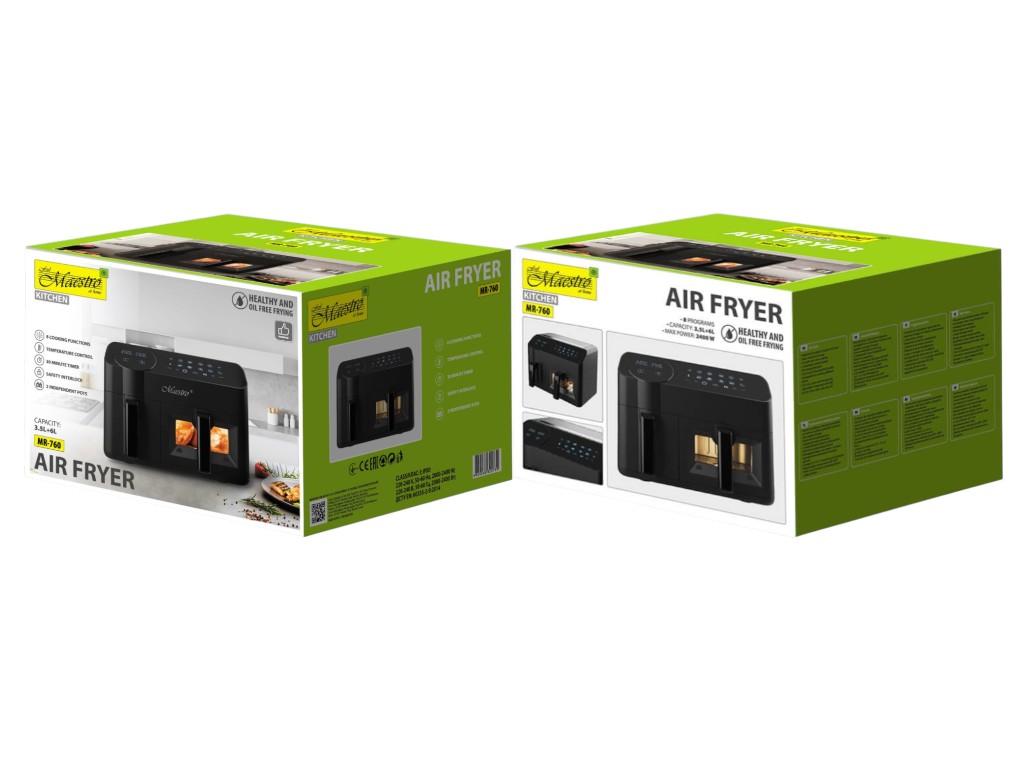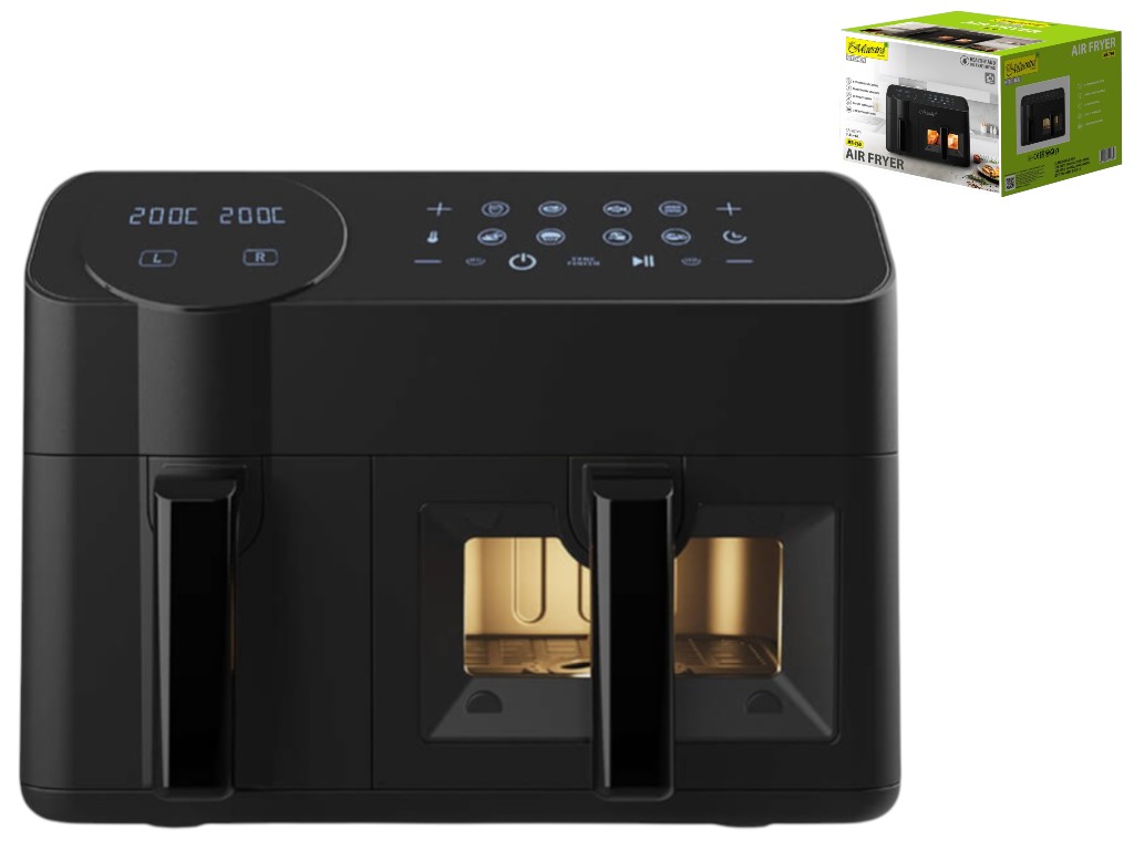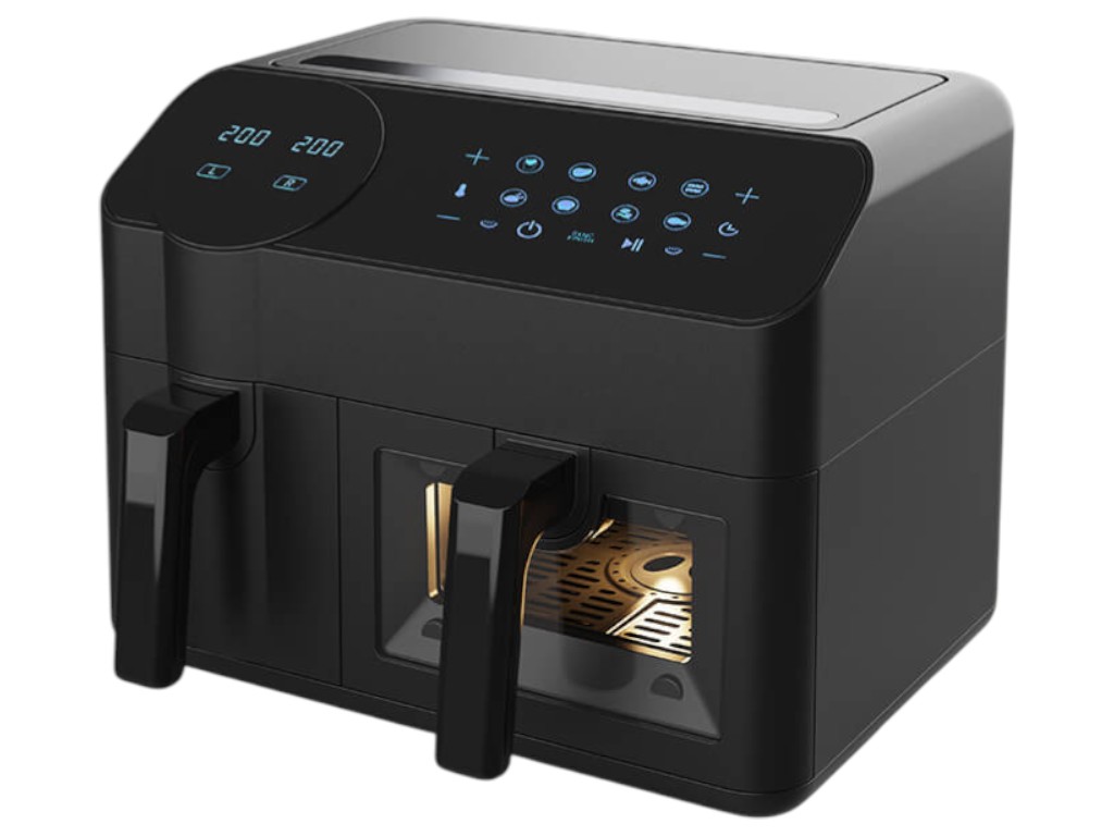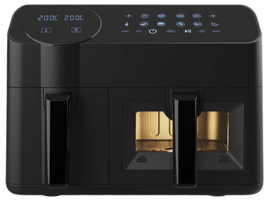 Призначена для смаження, запікання, дегідрації та приготування страв із мінімальною кількістю олії. Оснащена двома незалежними зонами нагріву із сенсорною панеллю та цифровими дисплеями. Має 8 автоматичних програм з можливістю ручного налаштування часу та температури, а також функцію синхронного закінчення приготування. Звуковий та візуальний сигнал нагадує про необхідність струснути або перевернути продукти. Вбудоване підсвічування, захист від перегріву і корпус, що не нагрівається, забезпечують безпеку і зручність в процесі експлуатації.